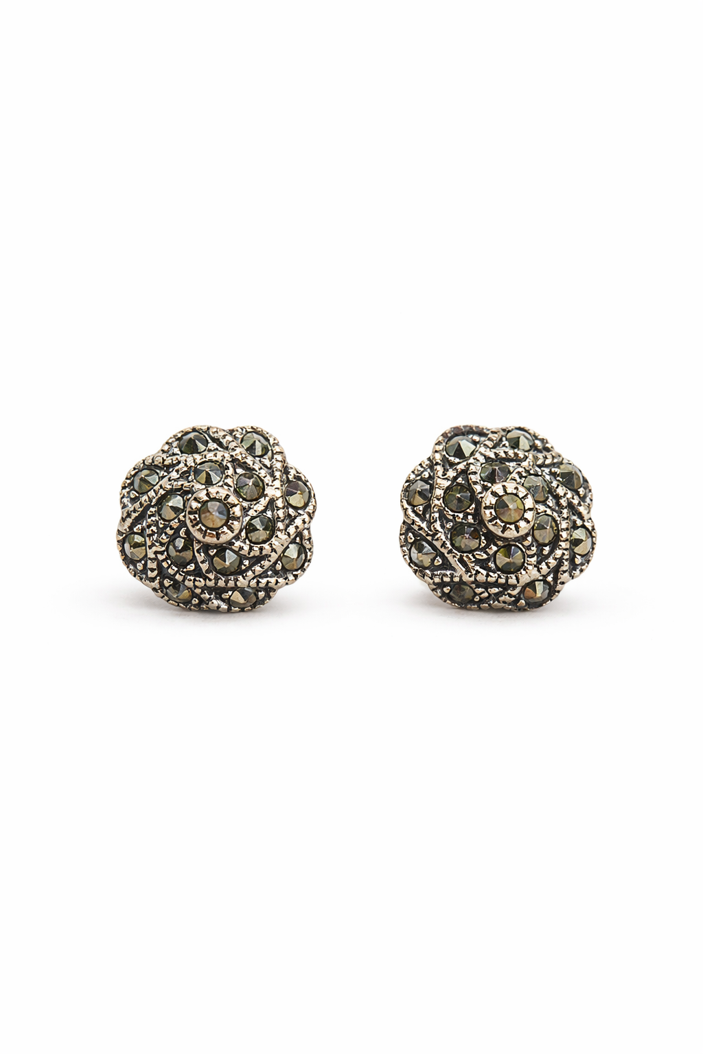 The Antique Noir Rose Stud Earrings capture the romance of a blooming rose through intricate metalwork and classic detailing. Designed in an oxidized silver-tone finish, each earring features layered, petal-like forms set with dark, faceted stones that shimmer subtly, creating depth and texture without overpowering shine.