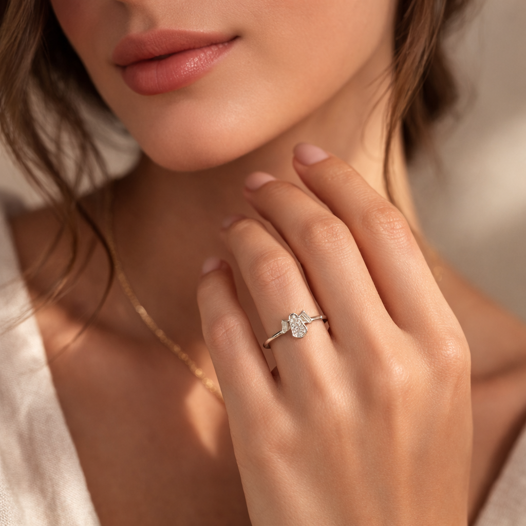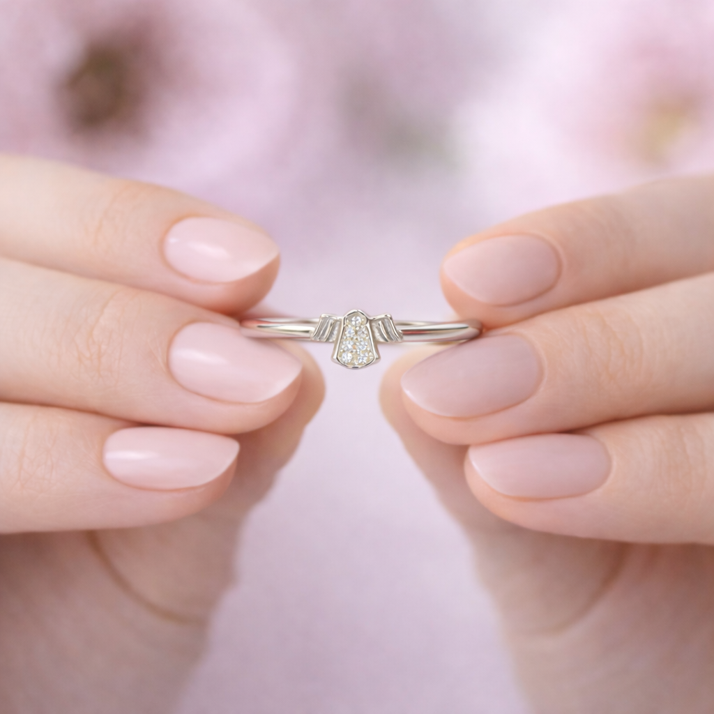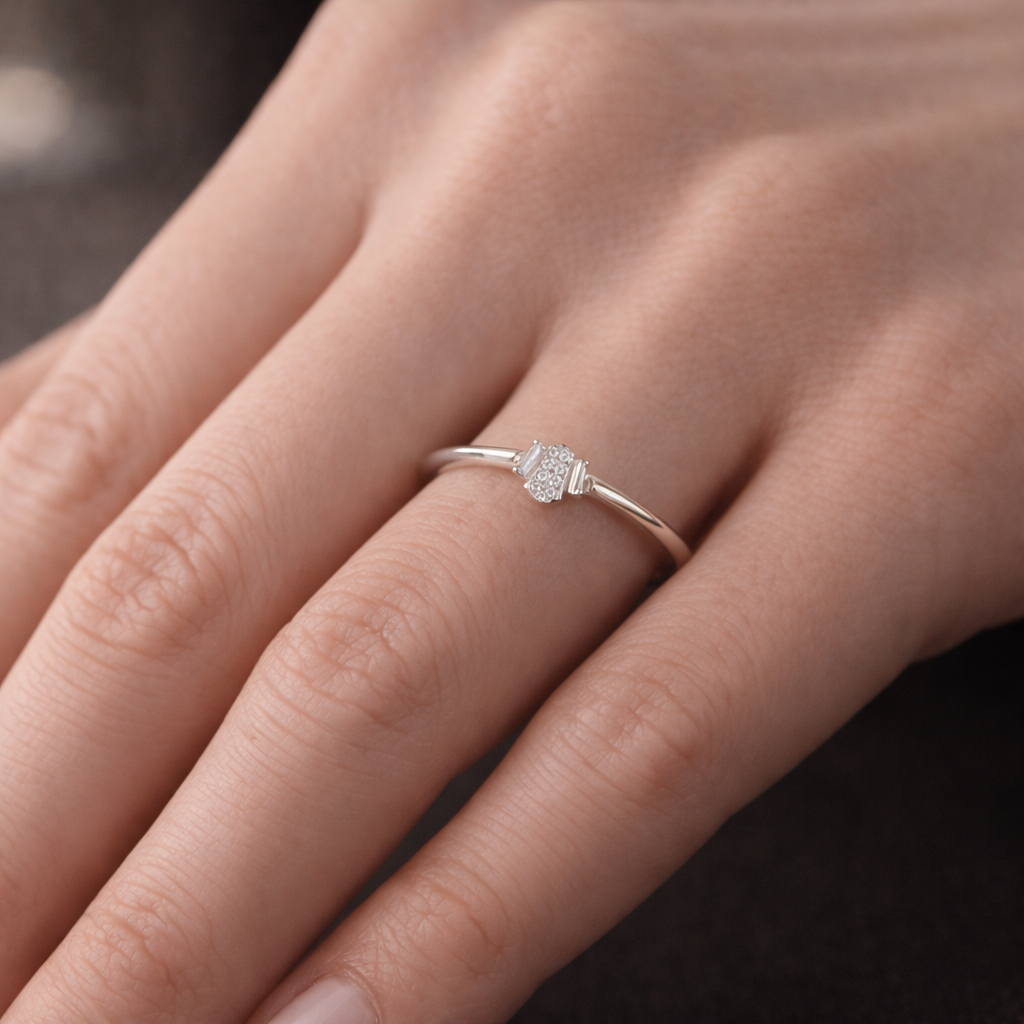 Its slender, polished band enhances the airy feel of the design, making the ring exceptionally comfortable for daily wear. Subtle curves and precise detailing reflect expert craftsmanship, while the soft sparkle adds a touch of quiet luxury without overwhelming the minimalist silhouette.
