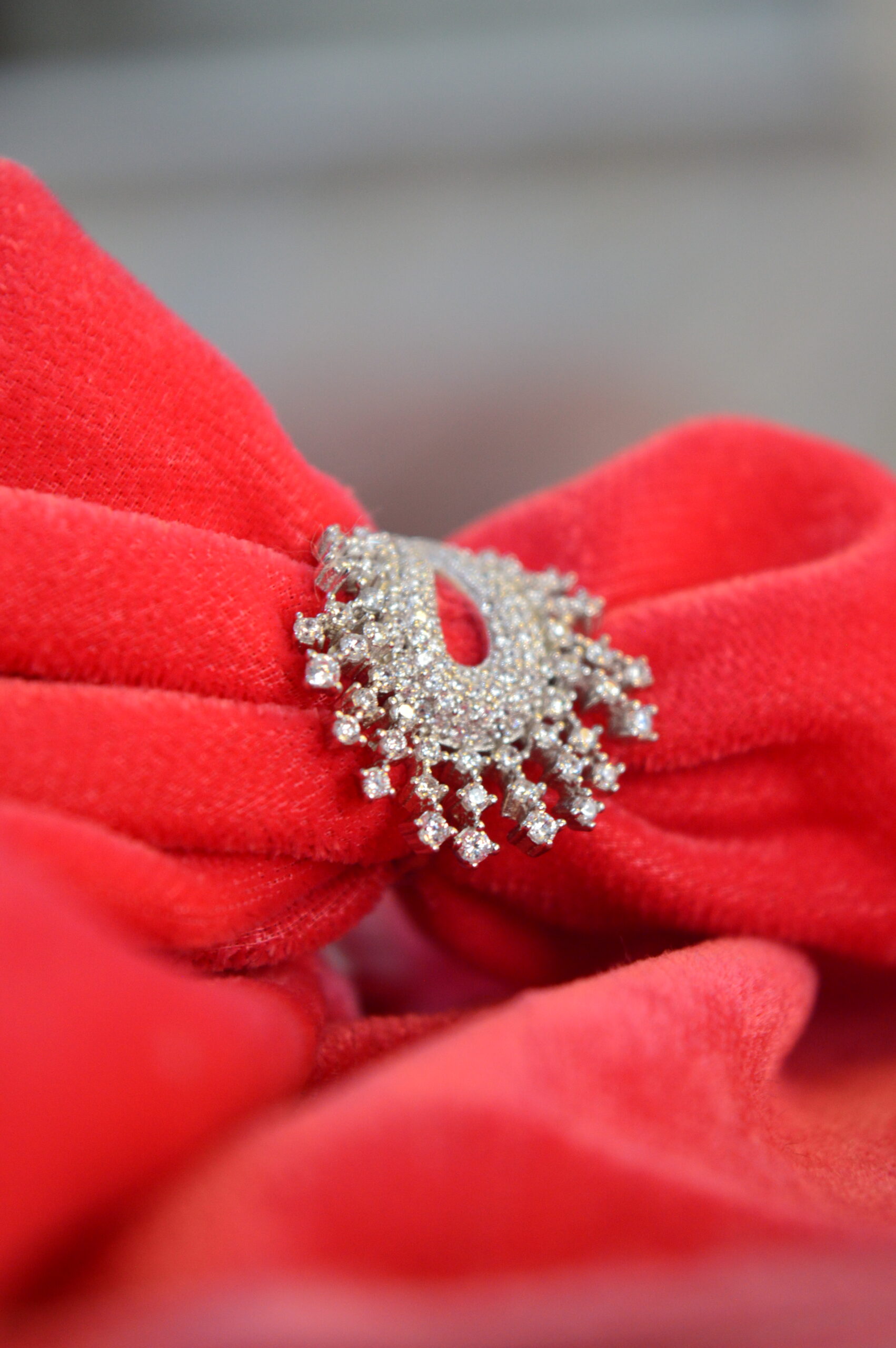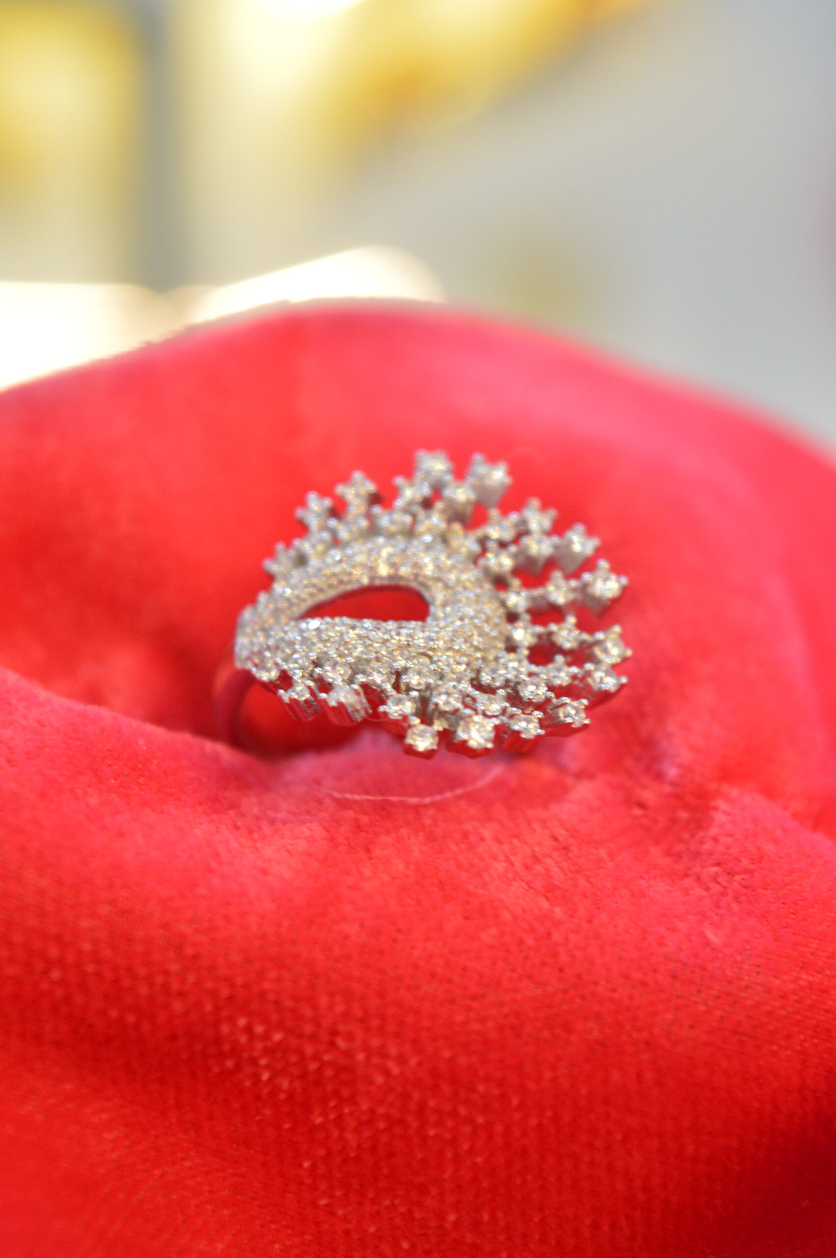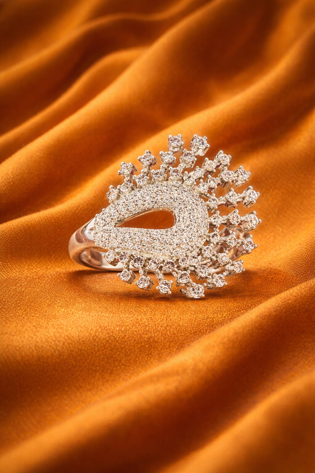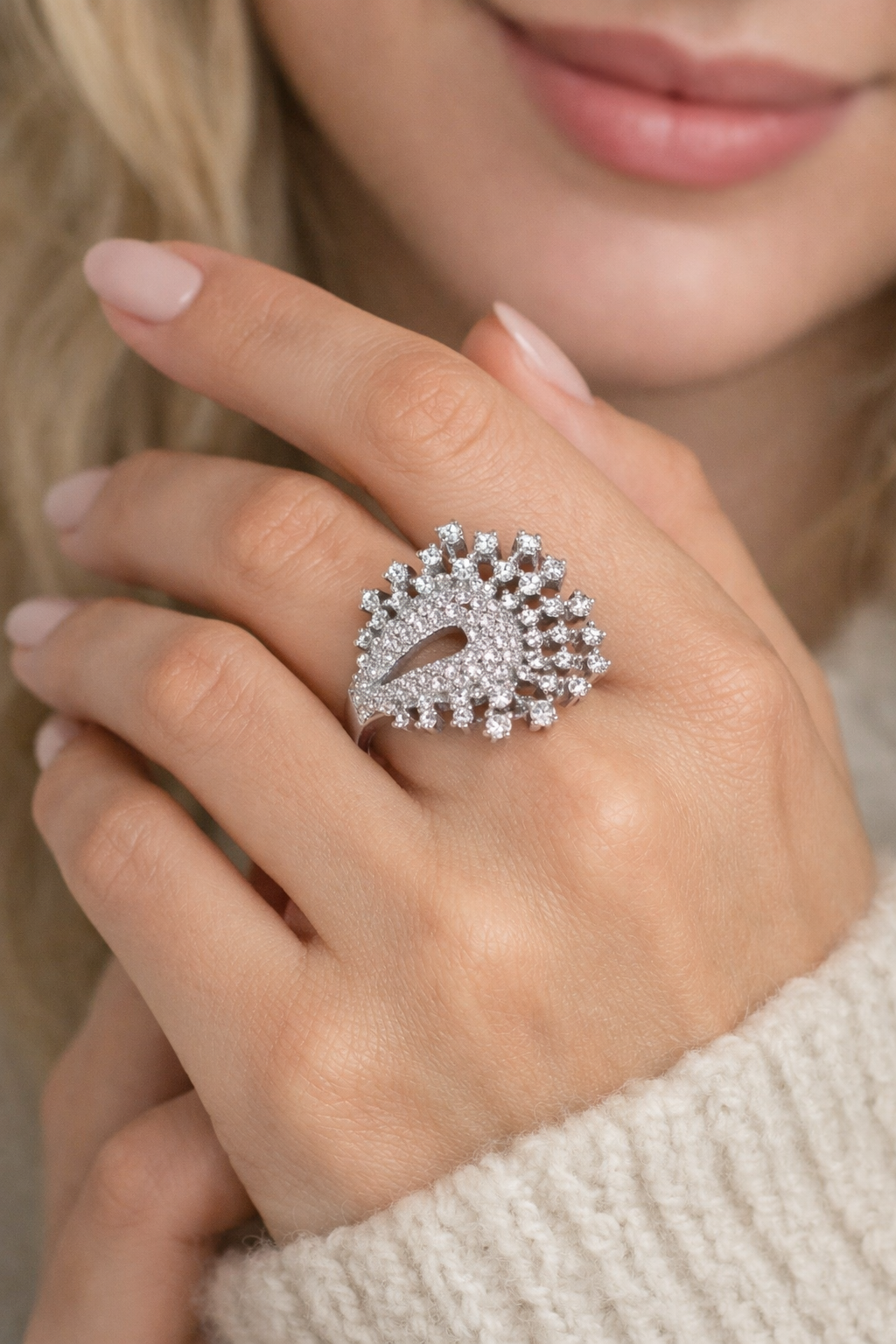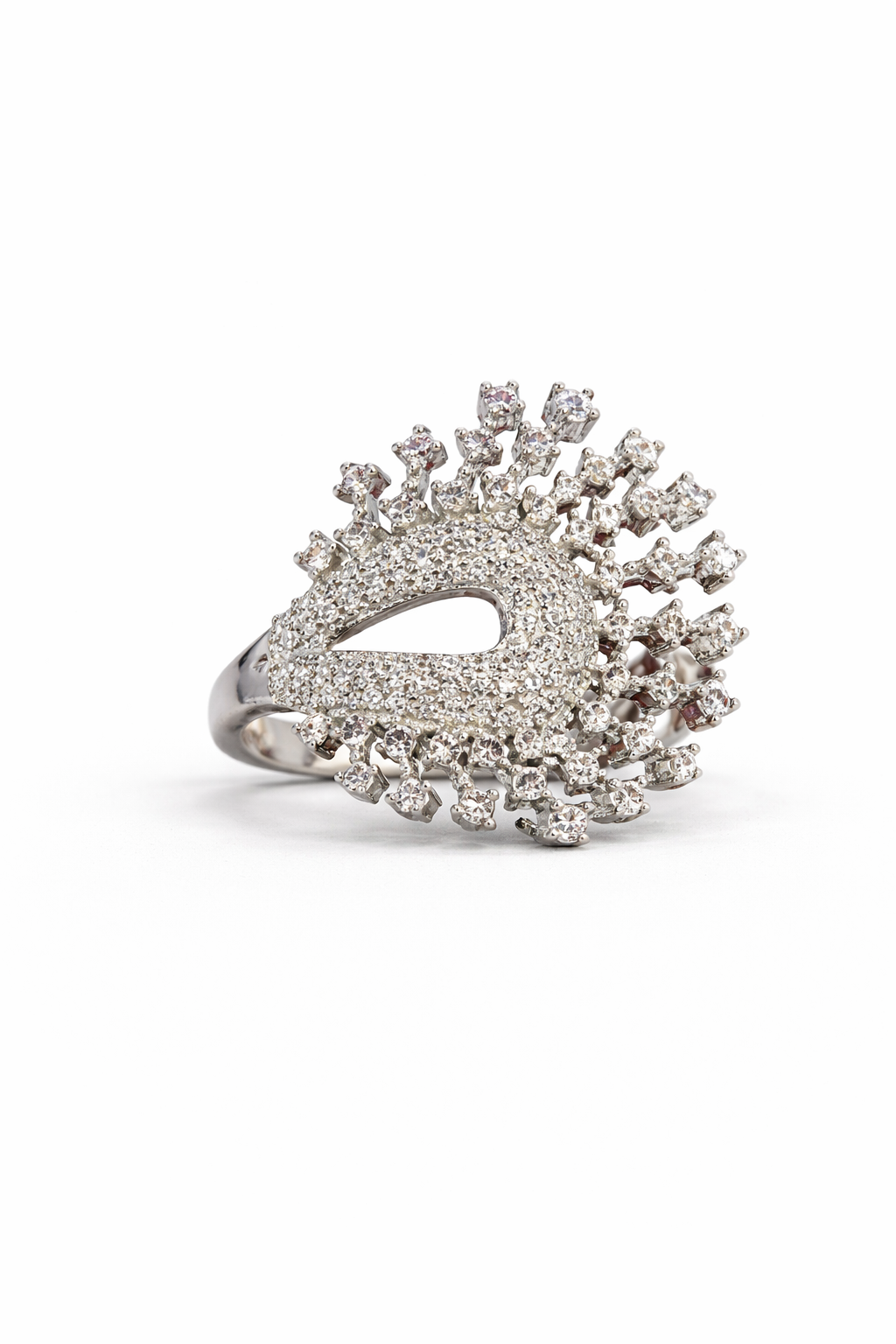 The intricate detailing and elevated structure give the ring a bold yet refined character, making it a true statement piece. Each sparkling element is carefully placed to enhance depth, texture, and luminosity, creating a luxurious visual effect from every angle.