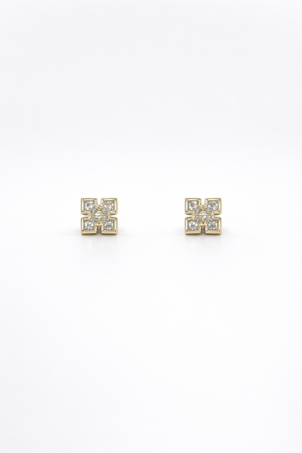 At the center, a cluster of shimmering crystals draws the eye, while each corner stone reflects light with captivating clarity. This balanced structure creates a harmonious blend of geometric precision and soft sparkle, making the earrings both contemporary and timeless.