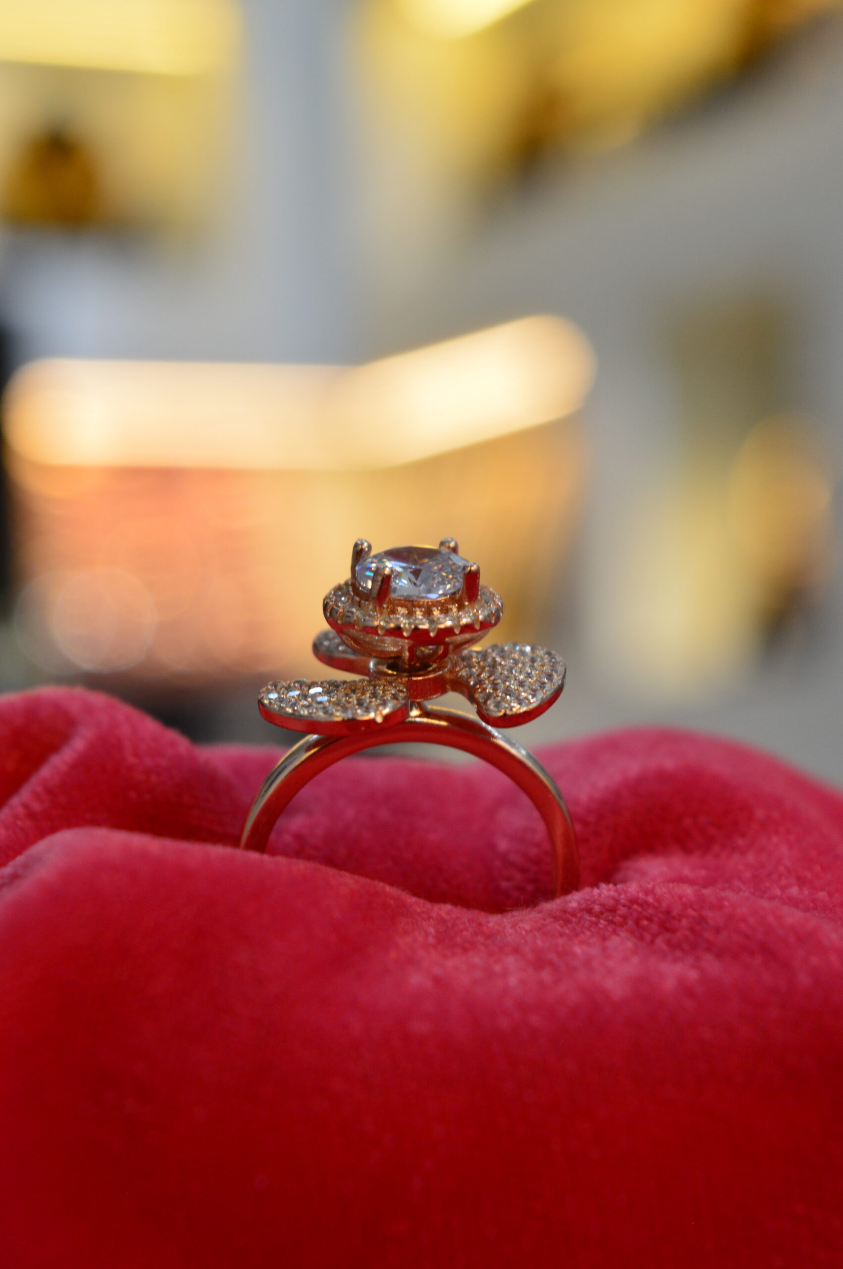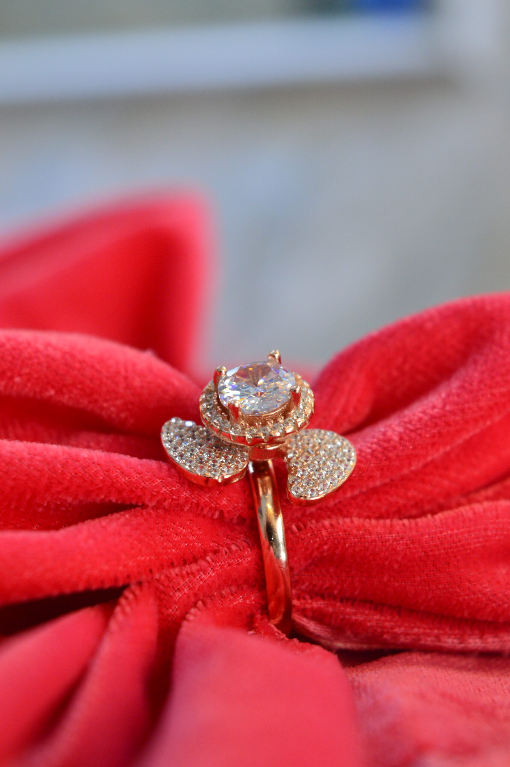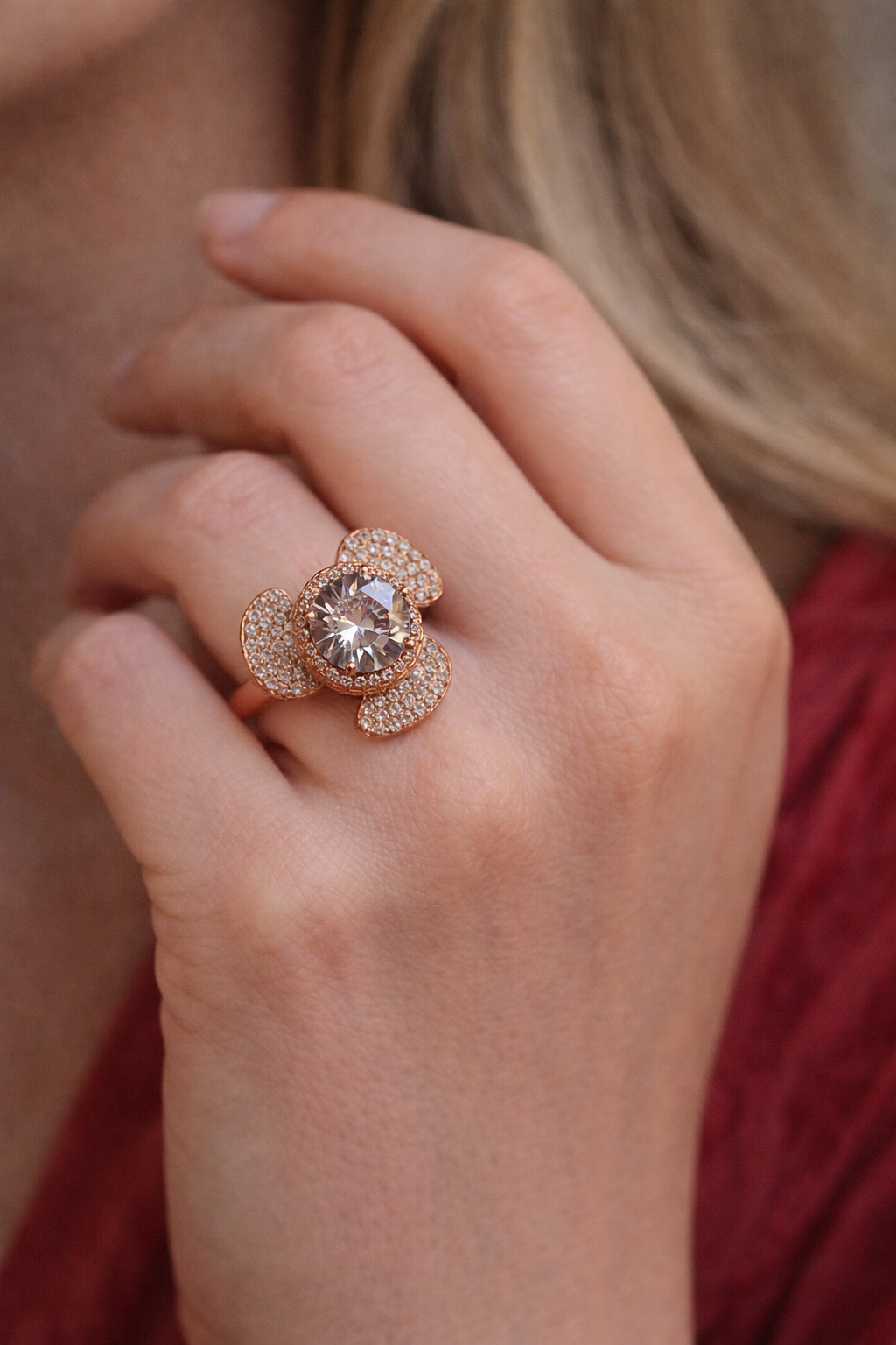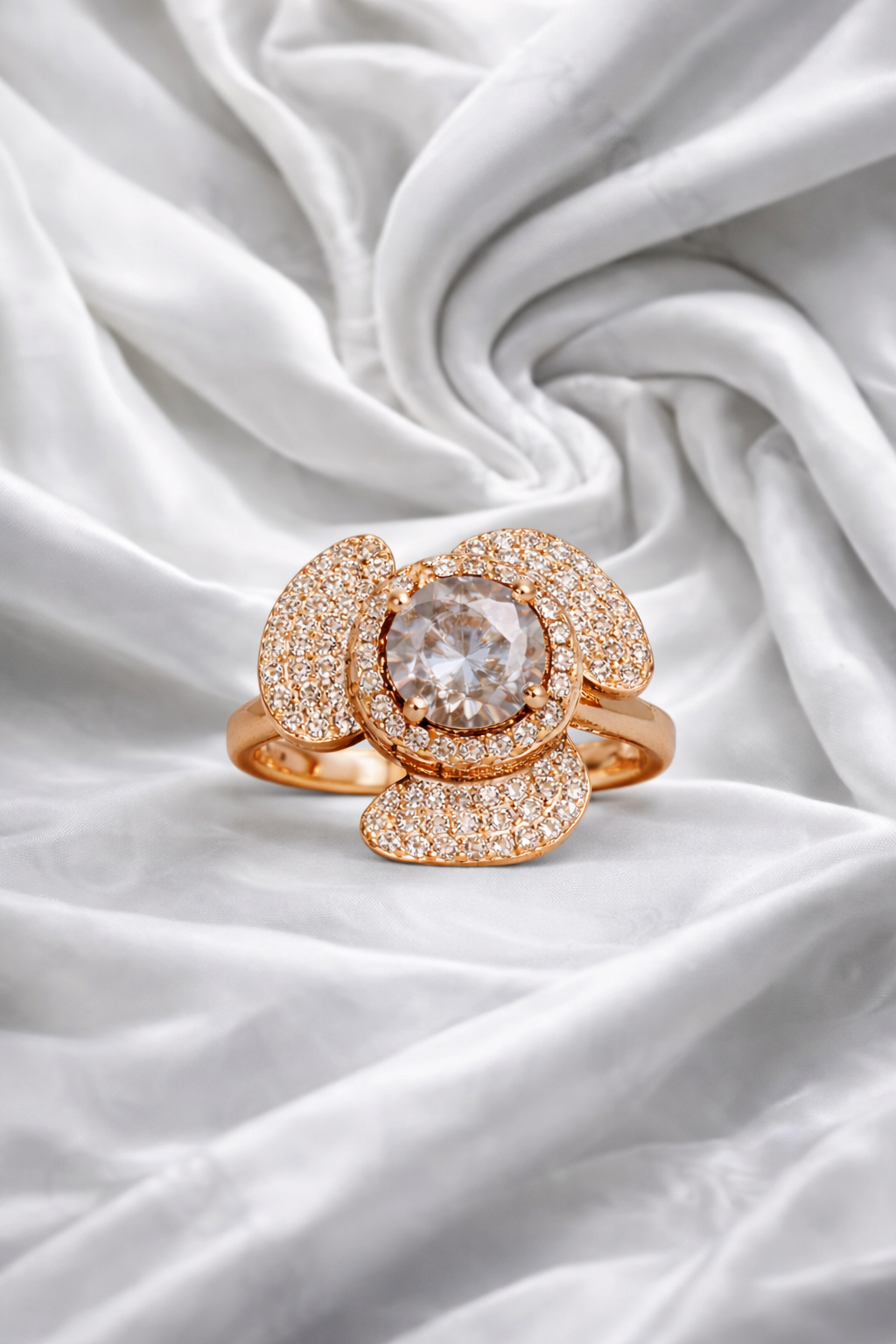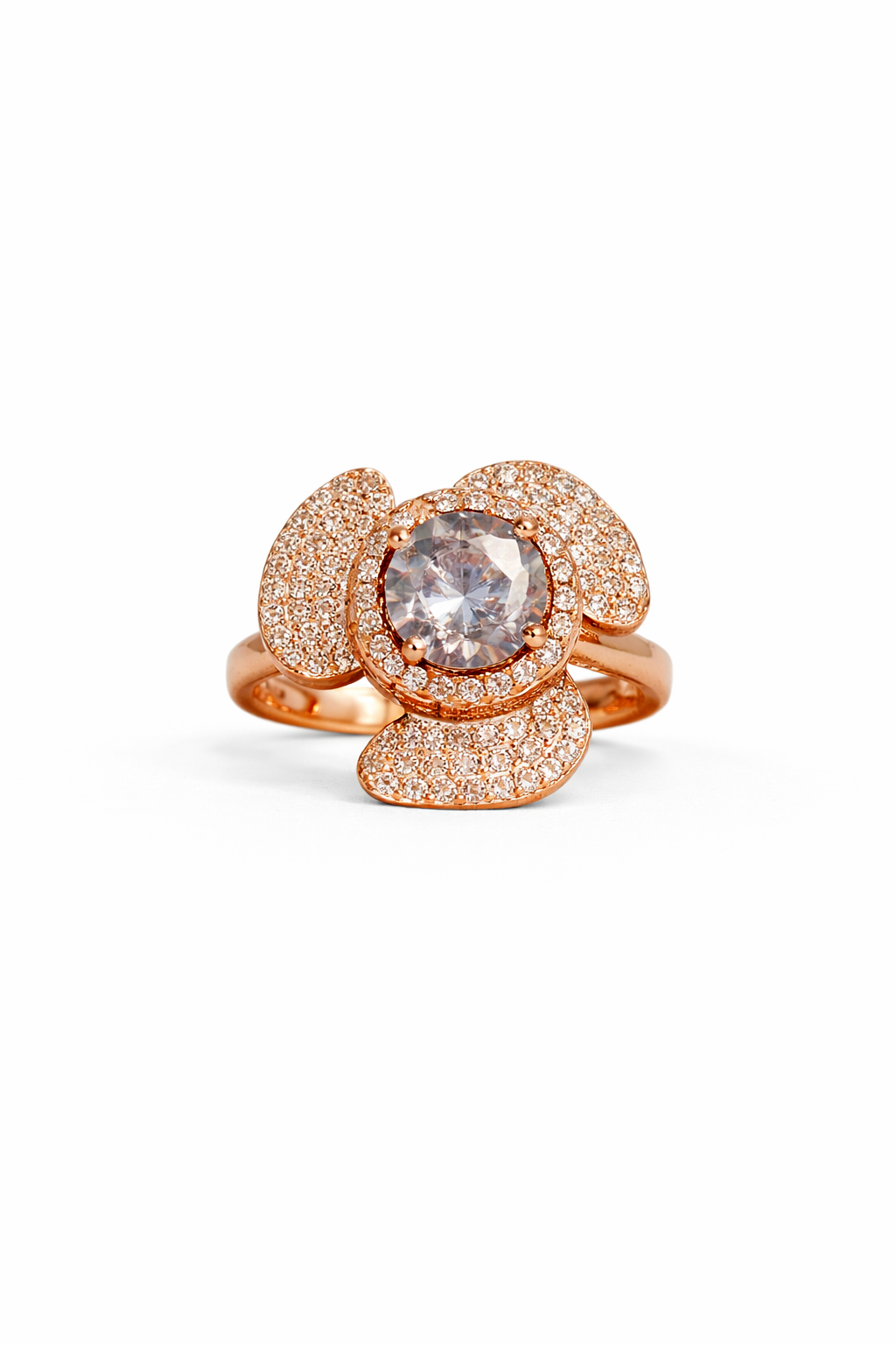 Gracefully arranged around the center are four petal-inspired elements, each encrusted with tiny shimmering crystals. This floral-clover silhouette creates a soft, feminine charm while adding dimension and luxurious detail to the design. The warm glow of the stones paired with the cool sheen of silver makes this ring truly captivating from every angle.