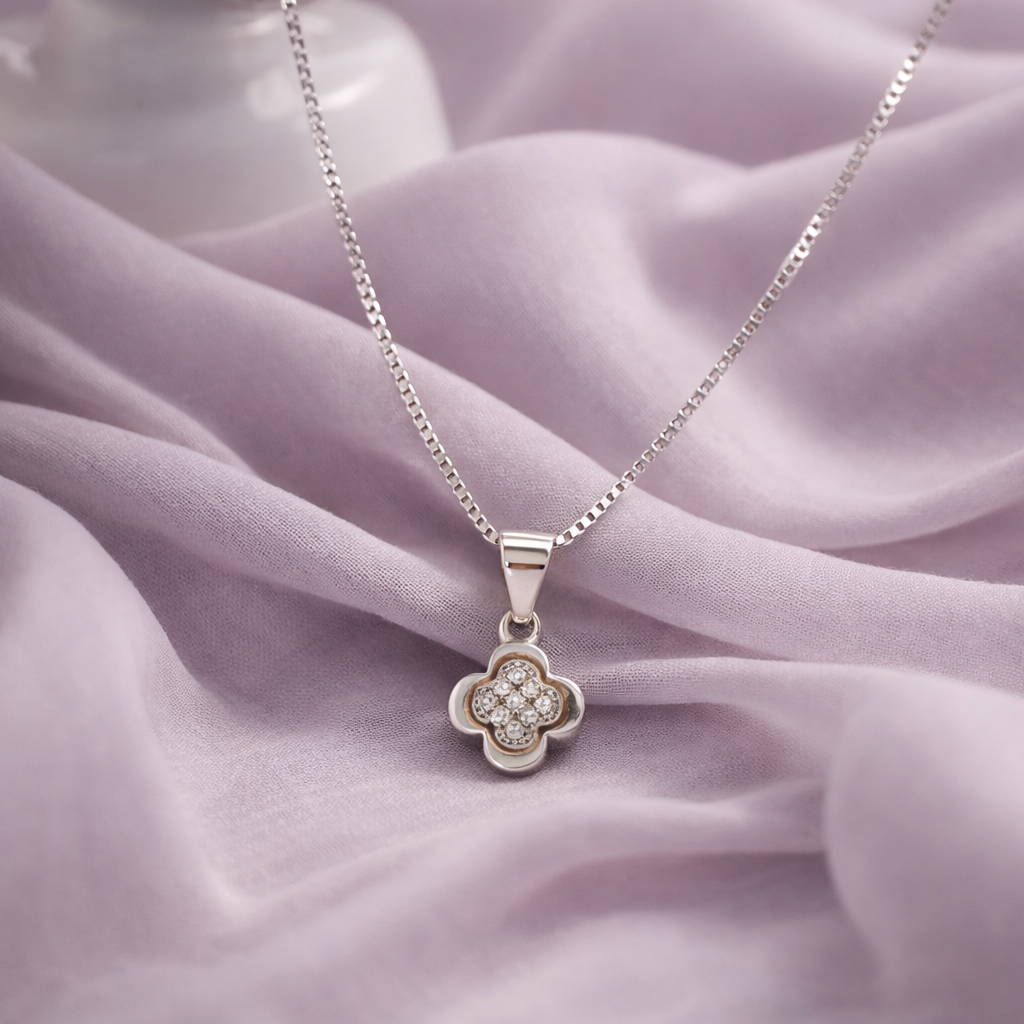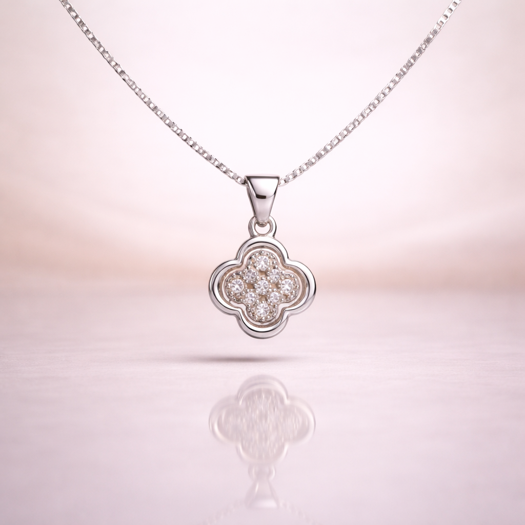 A pure silver floral pendant with a radiant cluster of shimmering stones, designed to reflect elegance, harmony, and timeless beauty.