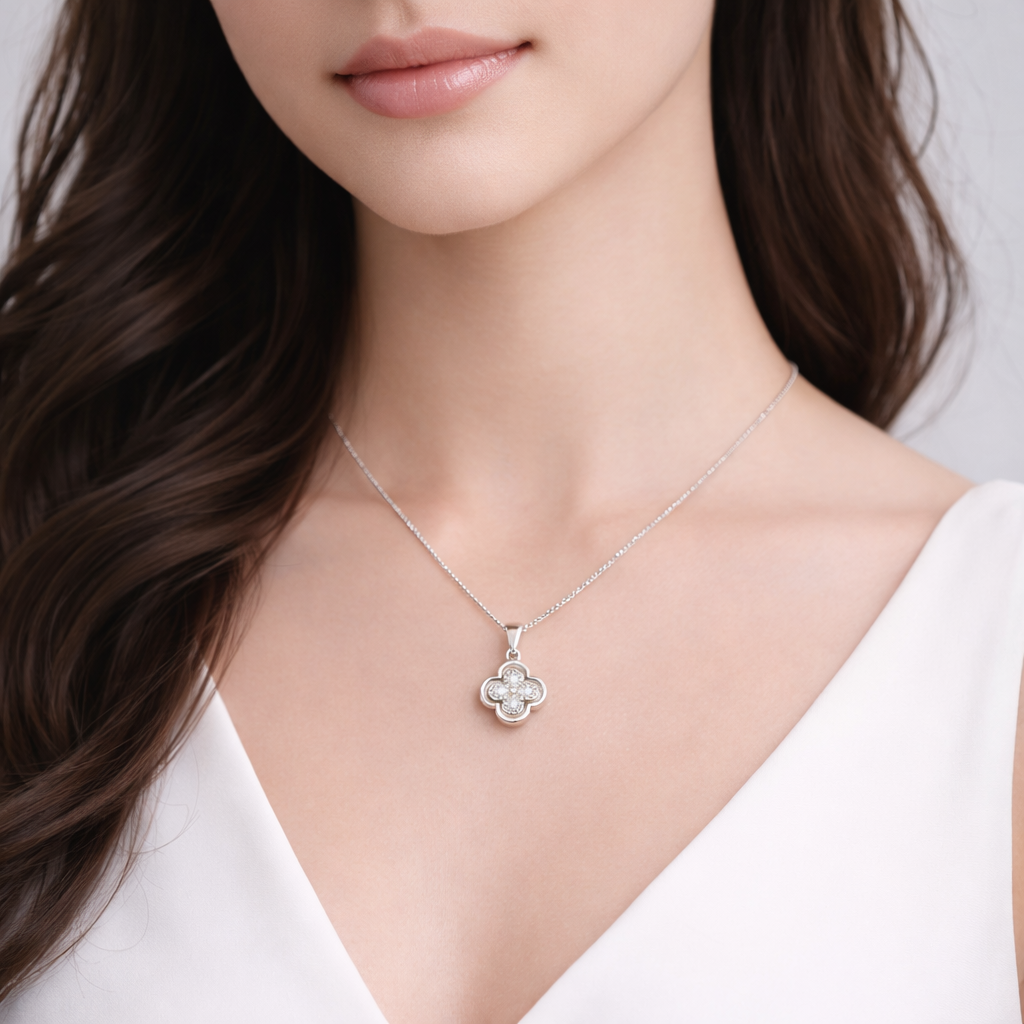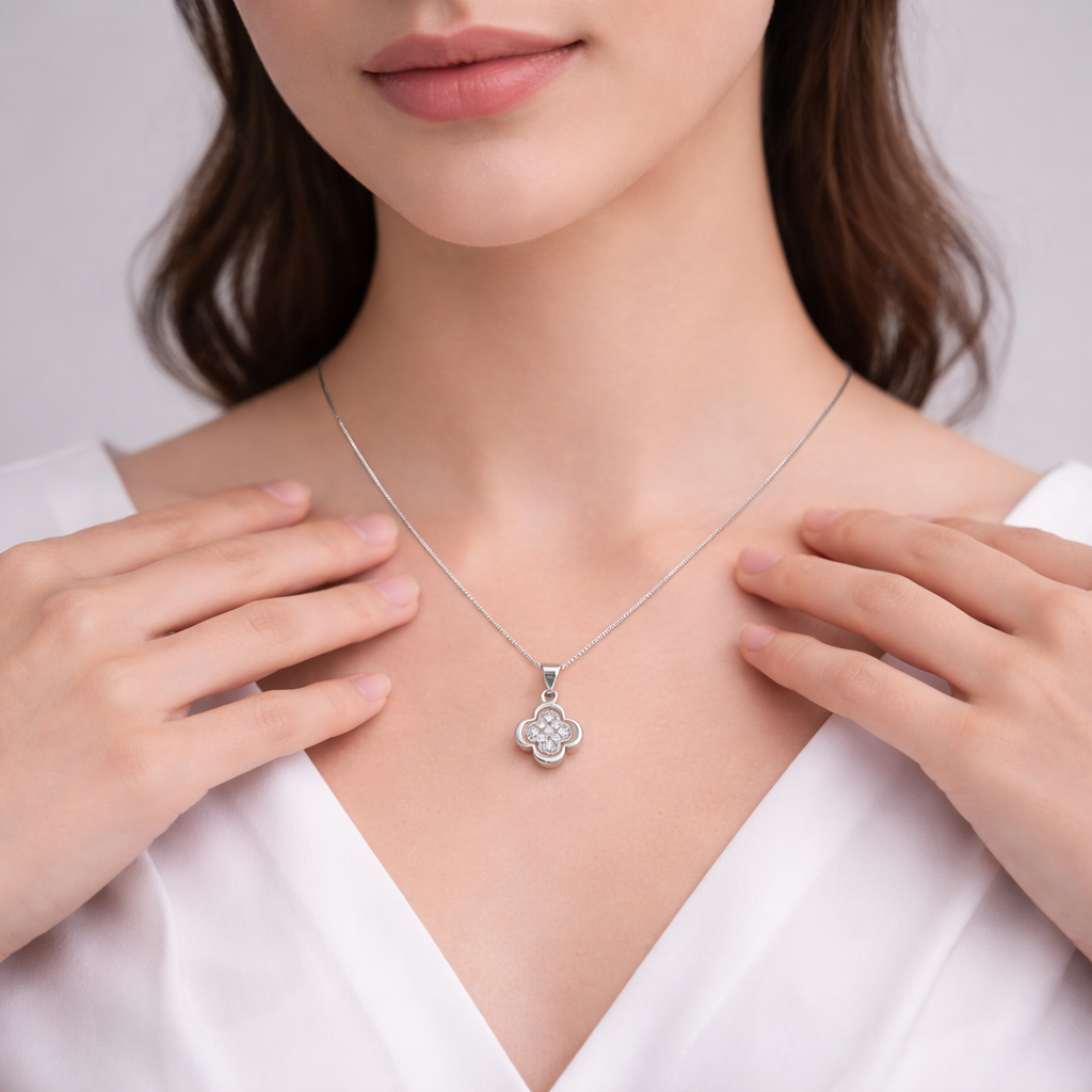The Celestia Bloomcrest Pendant is a refined symbol of grace, balance, and luminous craftsmanship. Expertly crafted from premium pure silver, this pendant features a delicate four-petal floral silhouette that represents harmony, renewal, and inner strength.