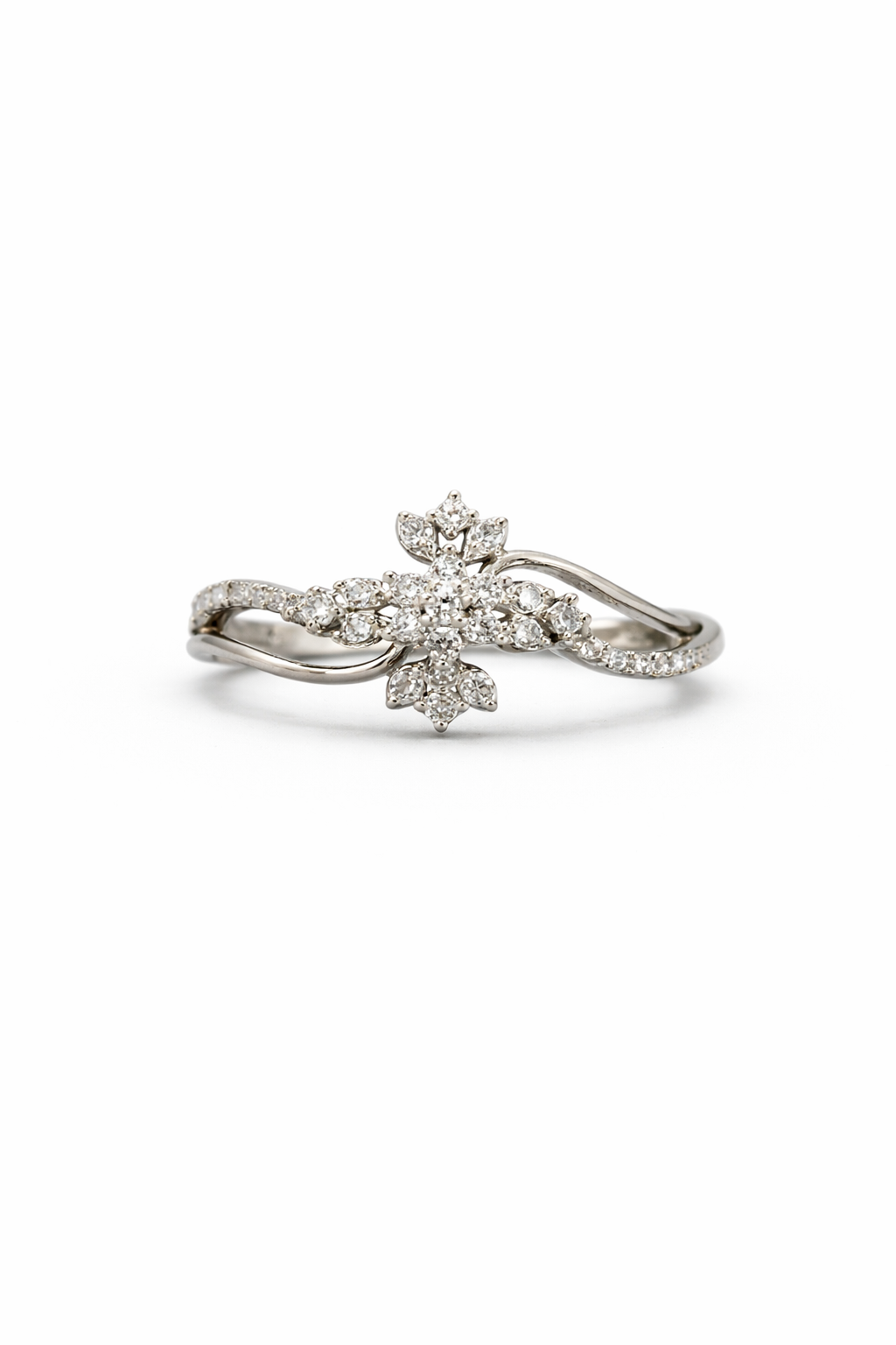 Its gently intertwining band design represents unity and balance, creating a flowing silhouette that feels both contemporary and timeless. The pavé-set stones along the band enhance its brilliance, adding depth and dimension to the overall look.