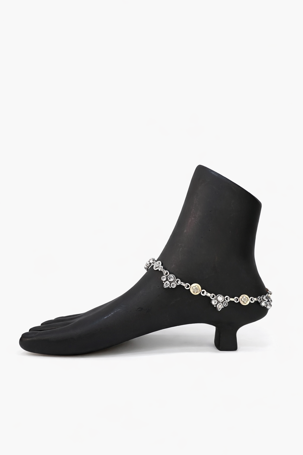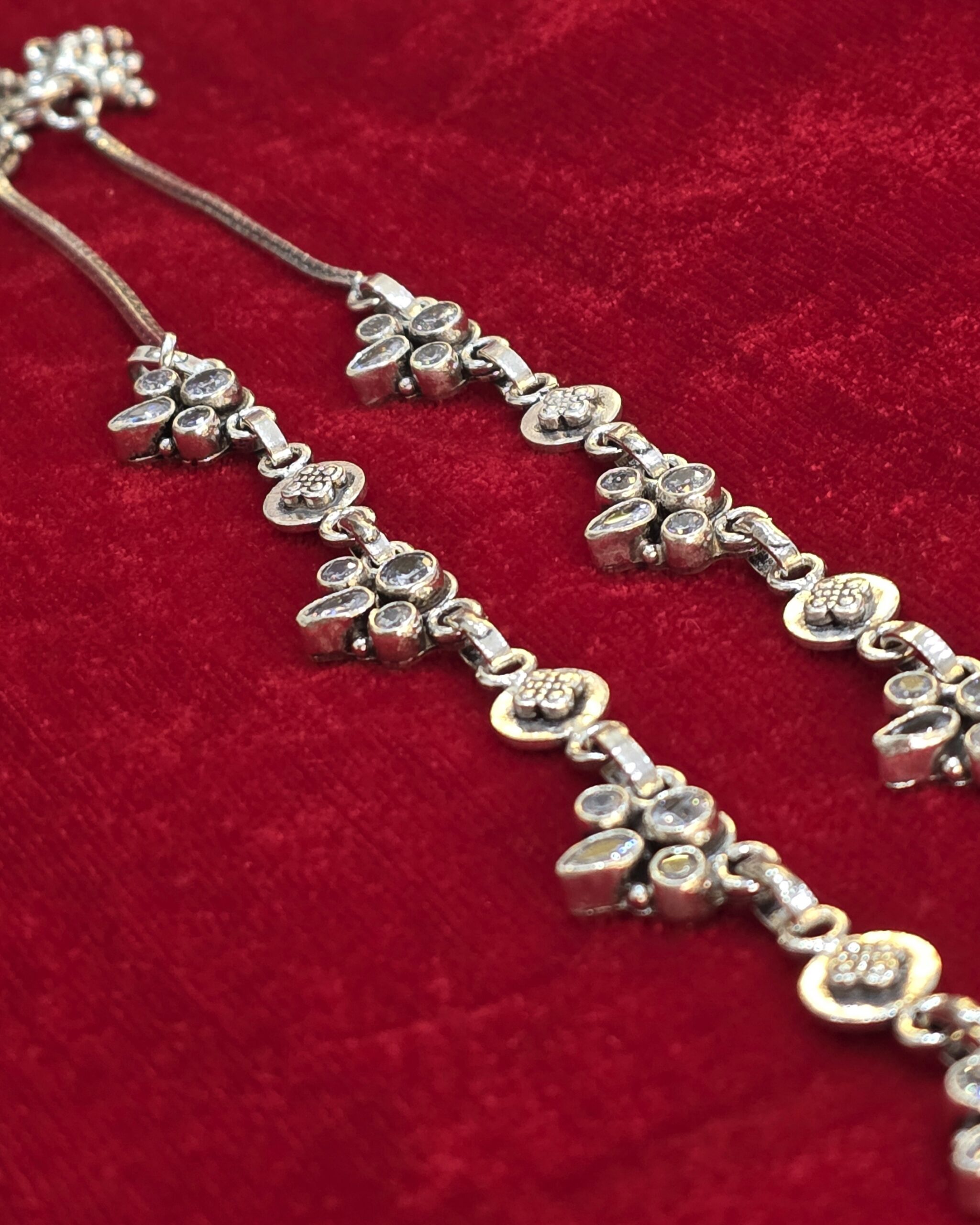 A delicate silver anklet adorned with floral motifs and shimmering stones, crafted to add timeless elegance to every step.
