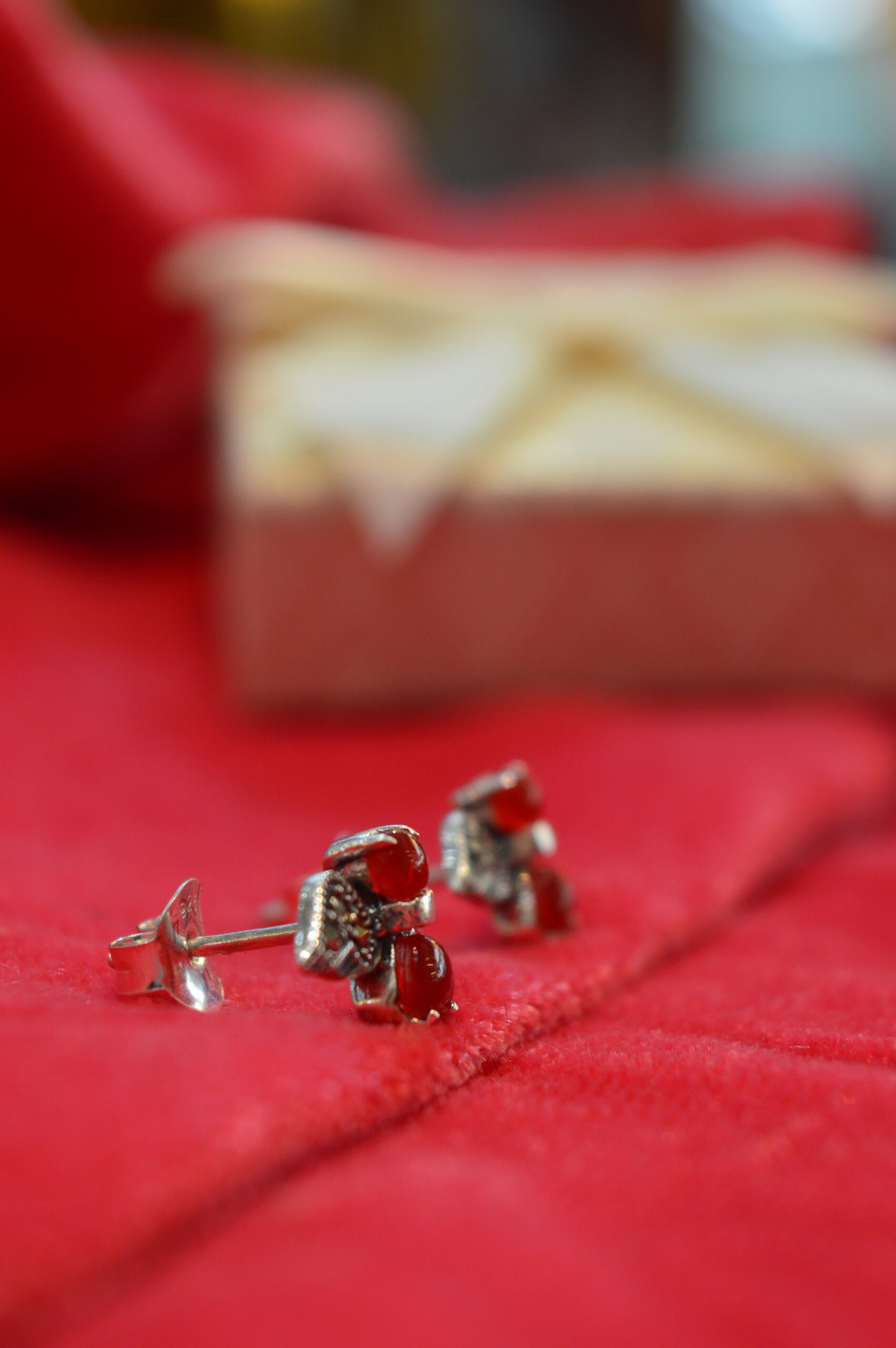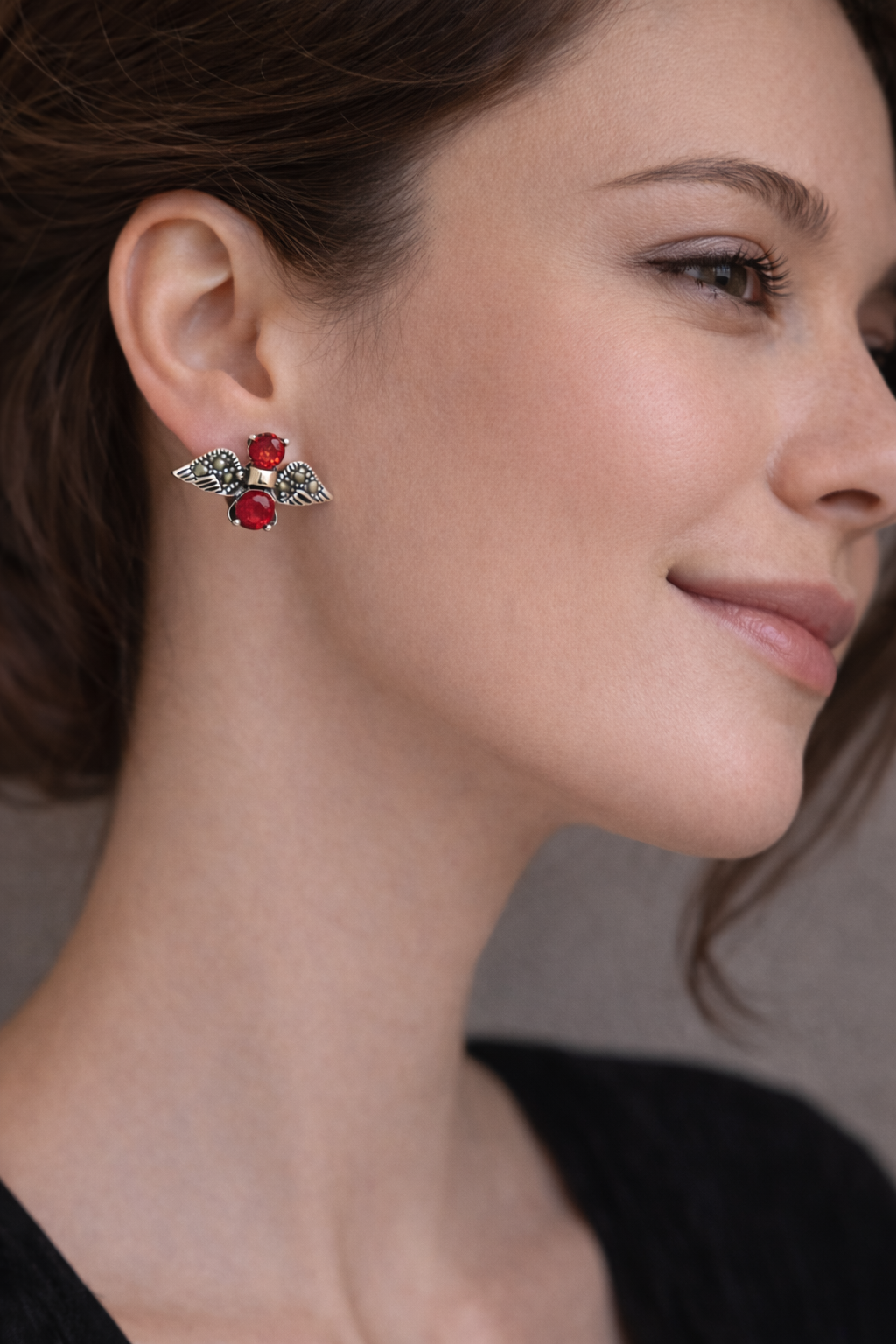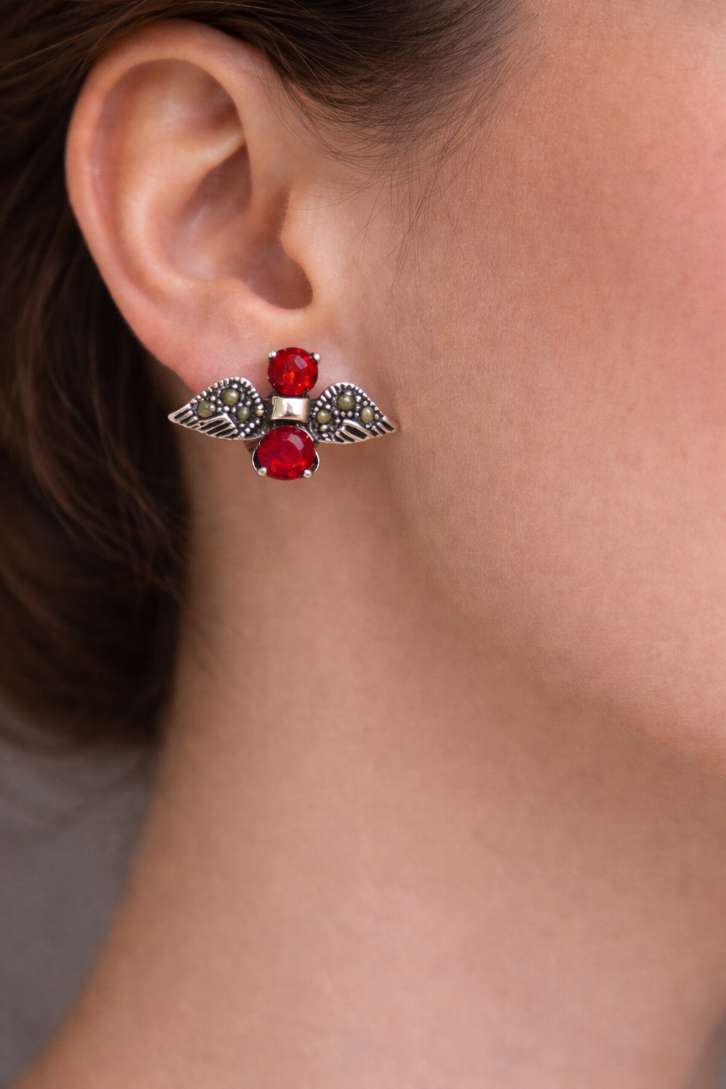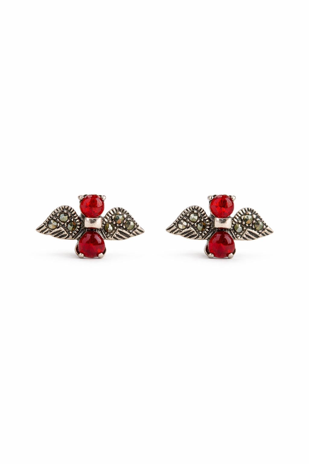 Charming angel-inspired stud earrings adorned with vivid red stones and vintage-style detailing.Details