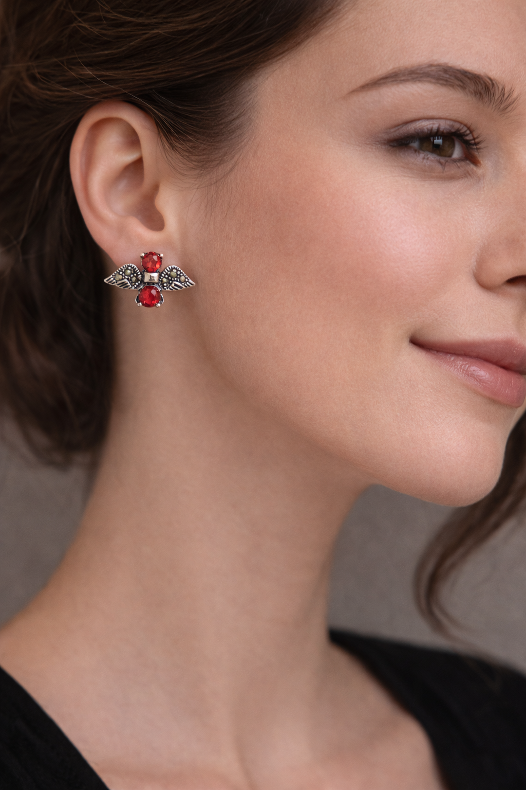 The Crimson Guardian Angel Stud Earrings blend symbolism with timeless design, creating a piece that feels both meaningful and stylish. Each earring is crafted in an antique silver-tone finish and shaped like a delicate angel, featuring brilliant crimson-red stones that form the body and halo, symbolizing love, strength, and protection. The finely detailed wings are accented with subtle, earthy-toned stones, adding depth and a touch of vintage charm.