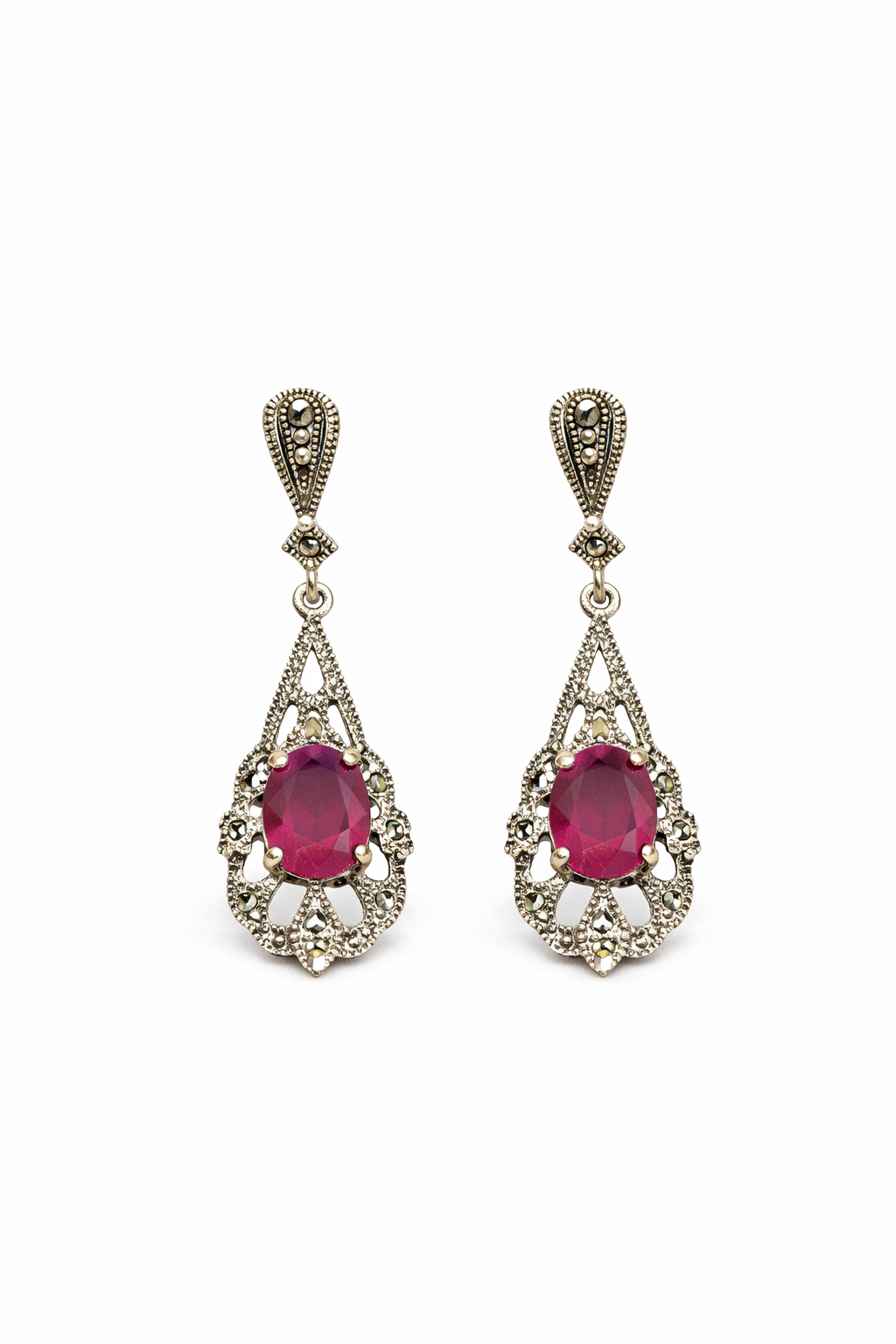 Elegant vintage-style drop earrings featuring a deep ruby-red center stone framed by intricate antique detailing.