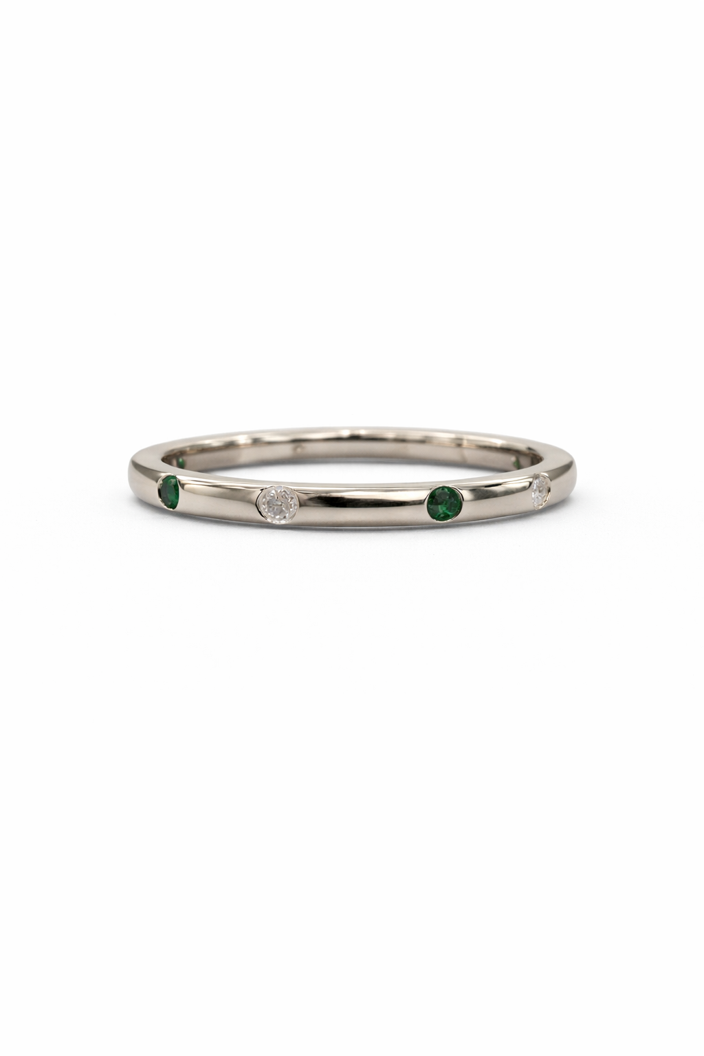 Set delicately along the band are alternating emerald-green and clear stones, creating a gentle rhythm of color and sparkle. These subtle accents add character without overpowering the design, making the ring perfect for those who appreciate understated luxury.