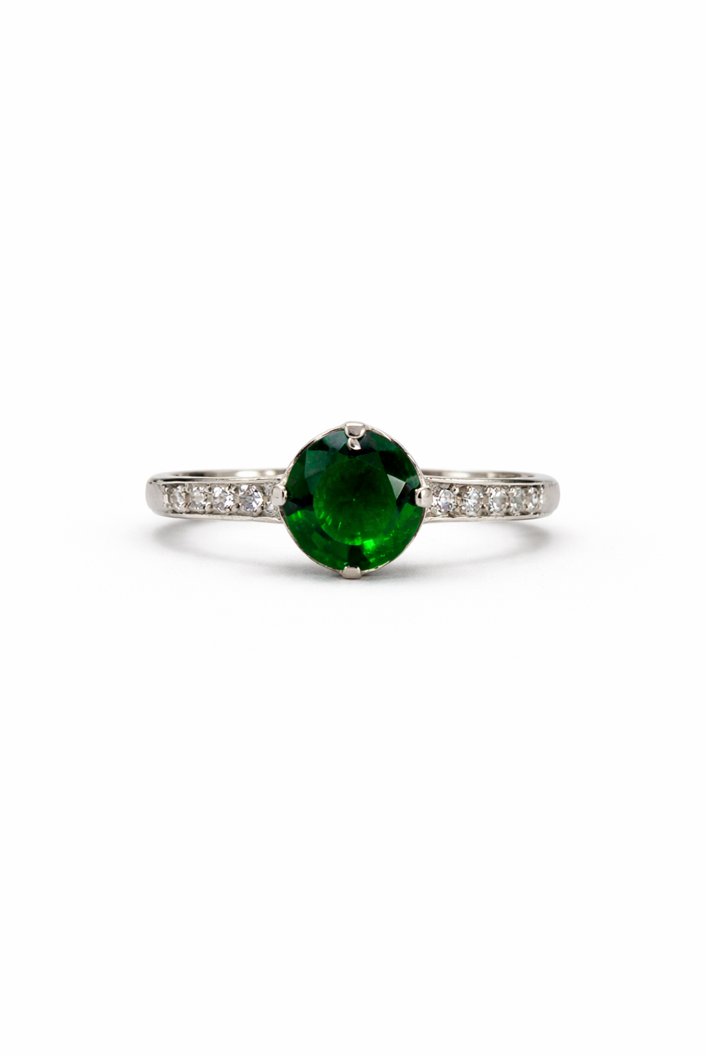A graceful pure silver ring featuring a radiant green centerpiece with sparkling side stones, designed for timeless elegance and everyday luxury.