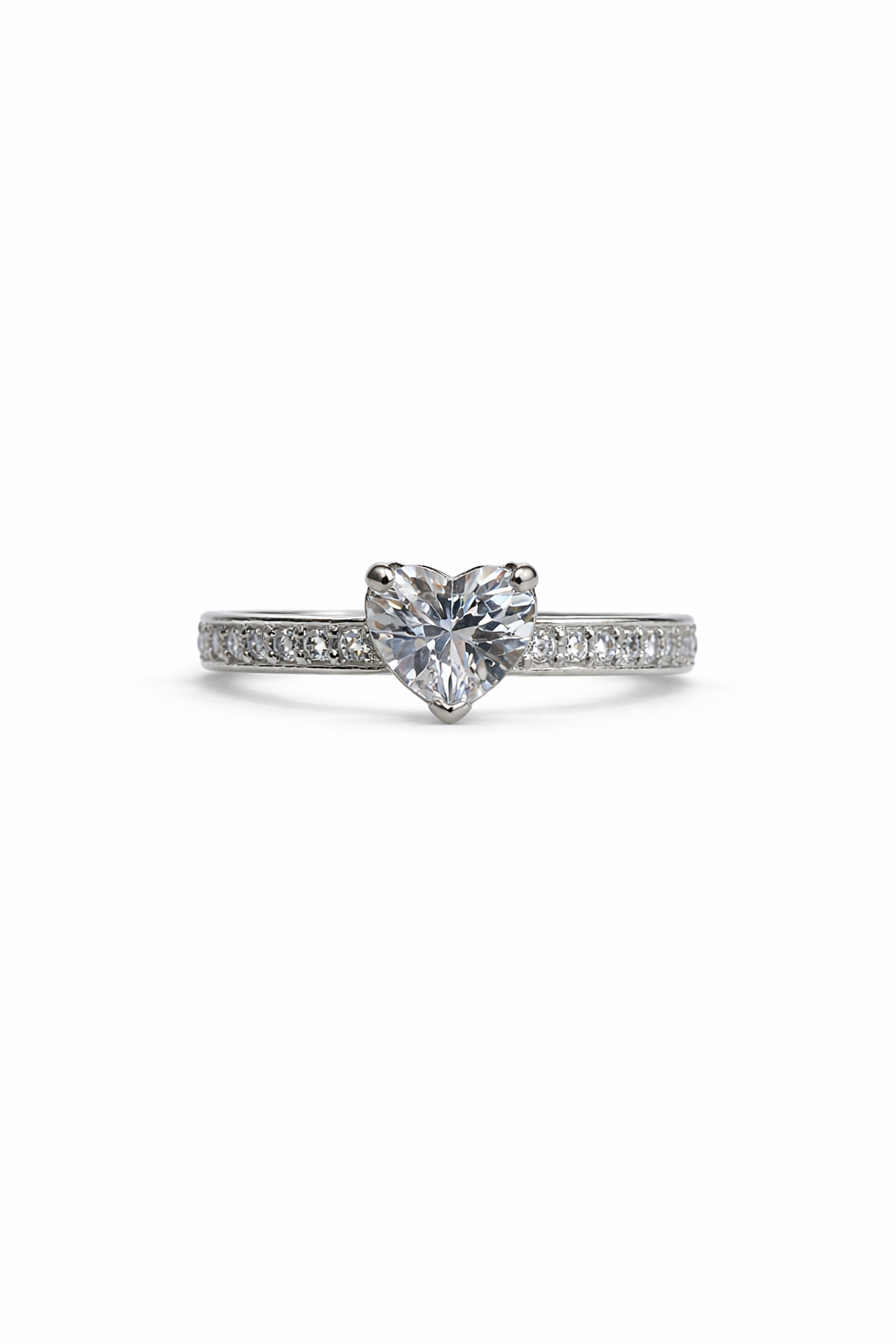 A graceful pure silver ring featuring a radiant heart-shaped center stone with shimmering accents, symbolizing everlasting love and devotion.