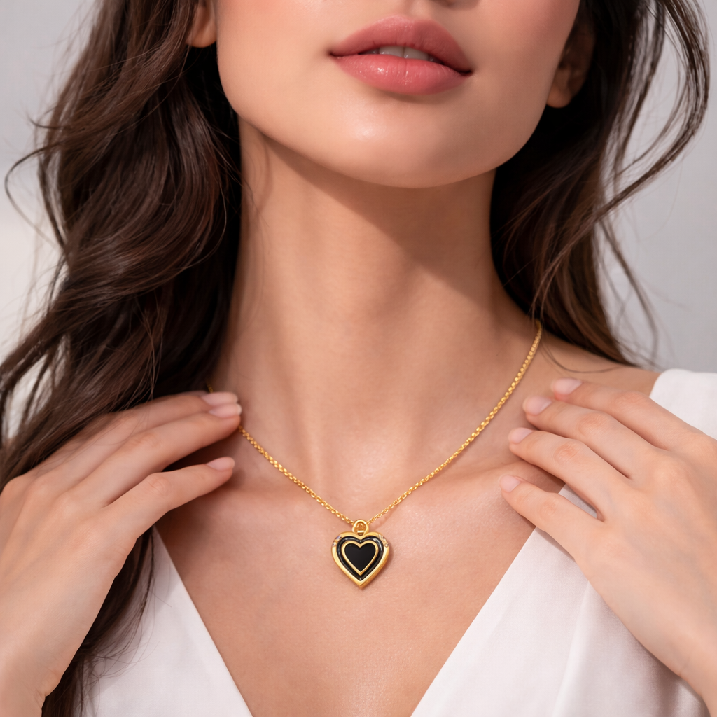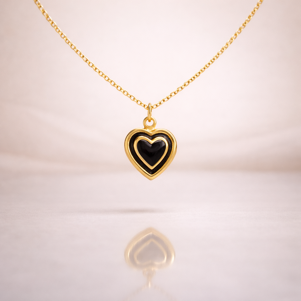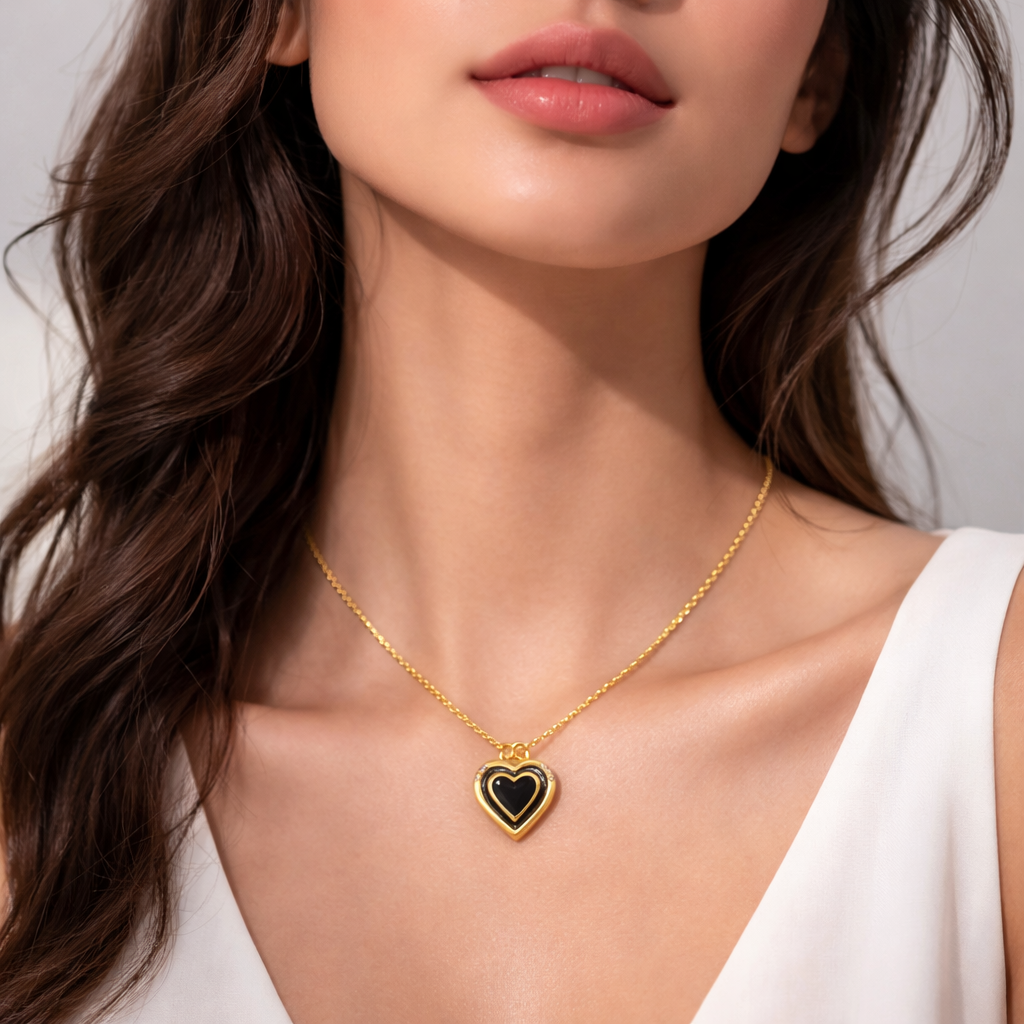 At its center lies a glossy black enamel heart, representing strength, devotion, and inner confidence. This striking core is embraced by a polished golden frame, delicately accented with subtle crystal details that add a soft shimmer under light. The contrast between dark and gold creates a captivating visual harmony, making the pendant both bold and graceful.