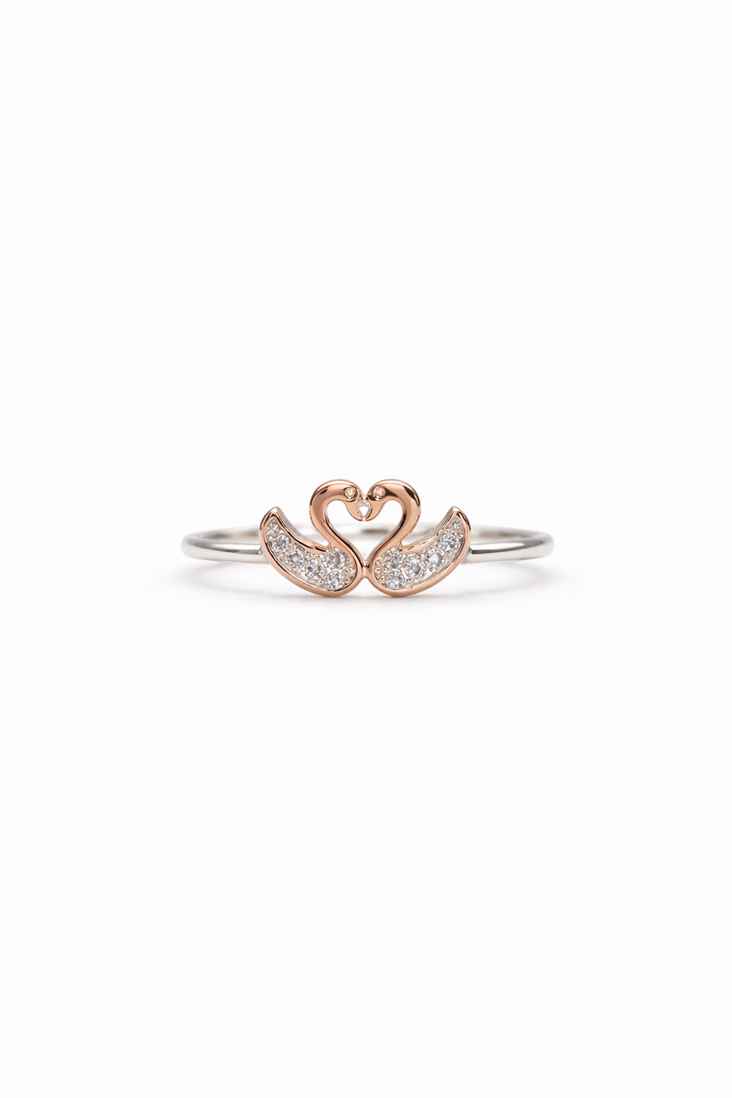 The swans’ wings are beautifully detailed with shimmering stones that add soft brilliance and texture, while subtle accents near the heart enhance its radiant charm. The polished silver band provides a refined contrast, ensuring comfort while maintaining a sleek, graceful silhouette.
