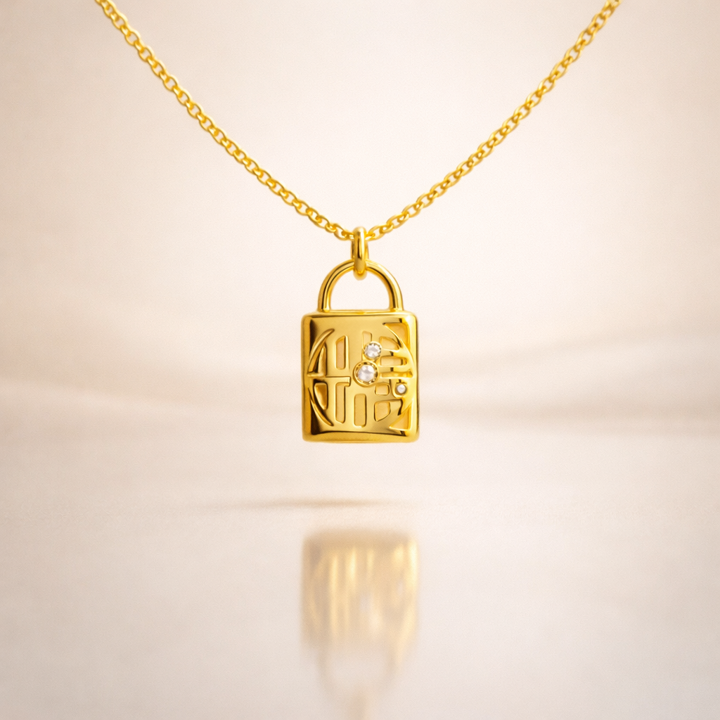 Designed in the form of a refined padlock, it represents protection, loyalty, and cherished promises. The front surface features intricate geometric detailing, enhanced with delicate crystal stones that add a subtle sparkle and elevate its luxurious appeal. Each polished edge reflects light gracefully, making this pendant shine with understated sophistication.