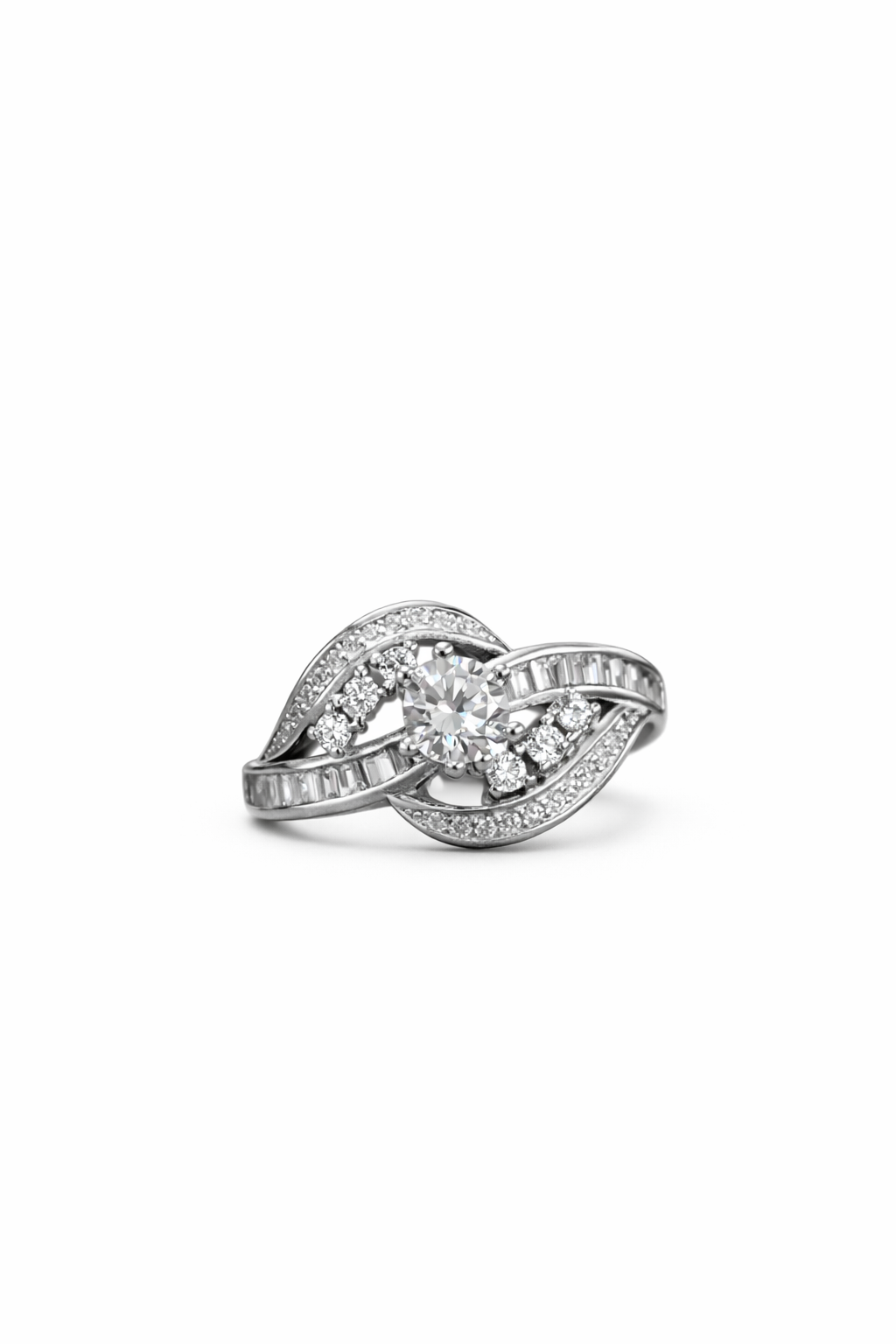 The flowing curves are adorned with shimmering accent stones and refined baguette-style details, creating a mesmerizing play of light from every angle. This layered design symbolizes everlasting love, connection, and harmony, making the ring deeply meaningful as well as visually striking.