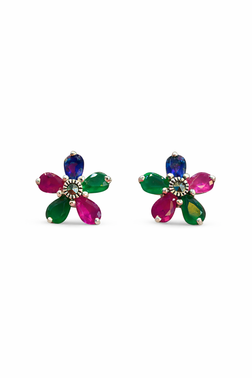 The Jewel Garden Bloom Studs capture the charm of a flower in full color. Designed with five marquise-cut gemstones forming delicate petals, each earring blends rich hues of emerald green, ruby pink, and sapphire blue for a lively, eye-catching effect. At the center, a finely detailed metallic accent adds a subtle vintage touch, balancing brilliance with craftsmanship.