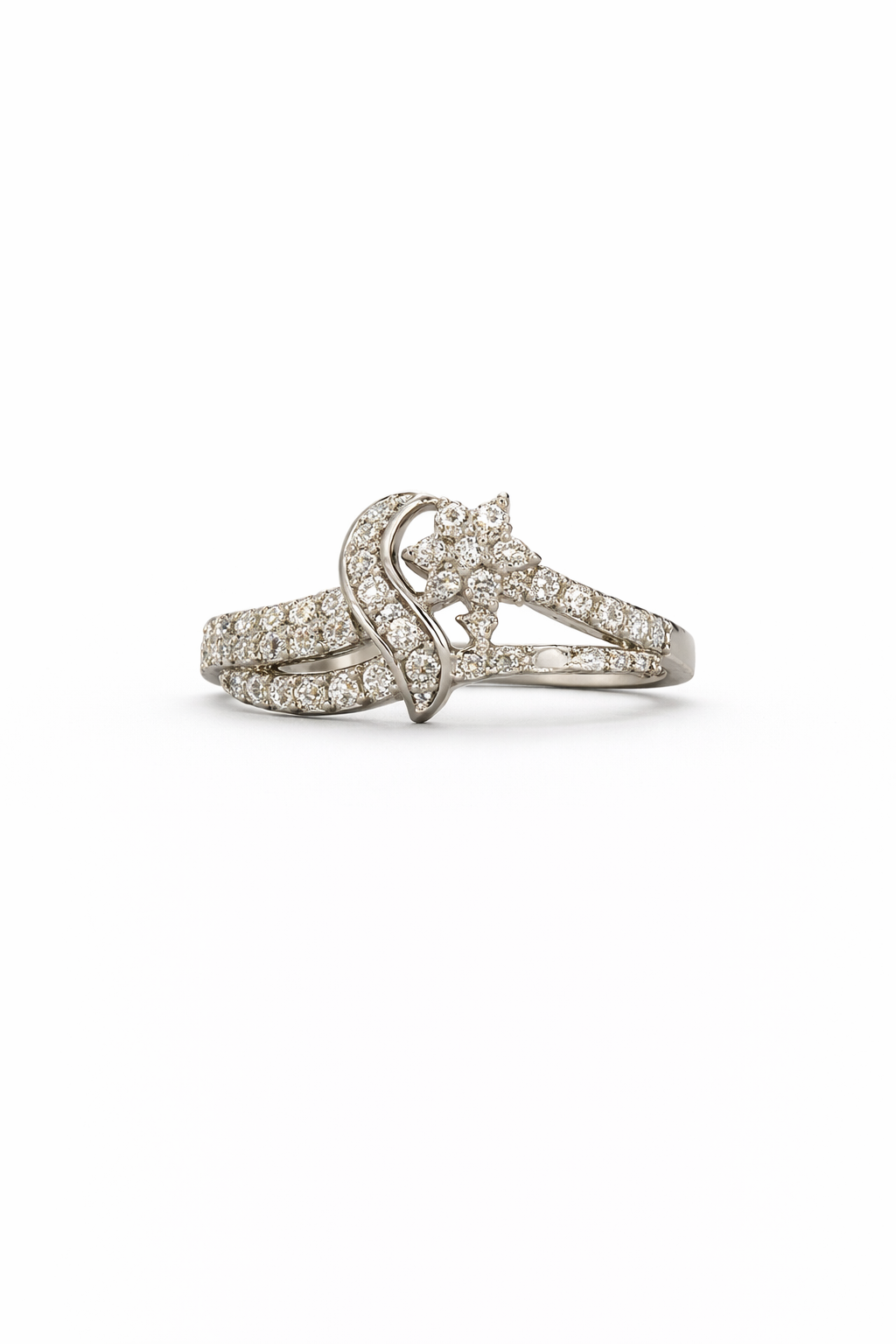 A graceful pure silver ring featuring a flowing wave design and a sparkling star-shaped cluster, symbolizing dreams, movement, and eternal elegance.