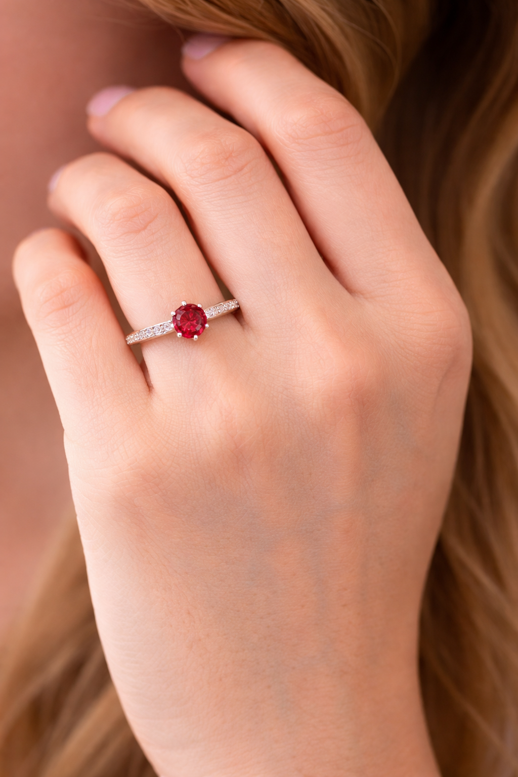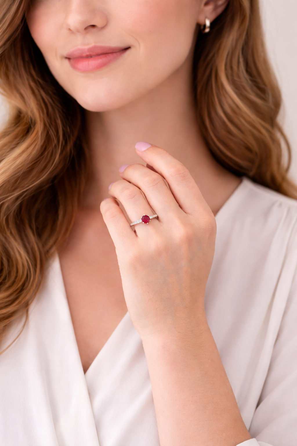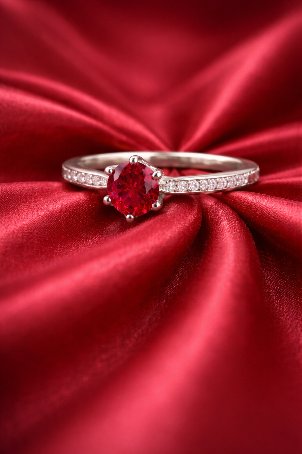 An elegant pure silver ring featuring a brilliant ruby-red centerpiece and delicate diamond accents, designed for timeless beauty and everyday luxury.