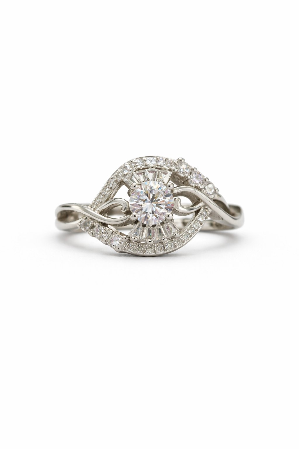 A dazzling pure silver ring featuring a radiant center stone embraced by intertwined infinity curves and shimmering accents, symbolizing eternal elegance and love.