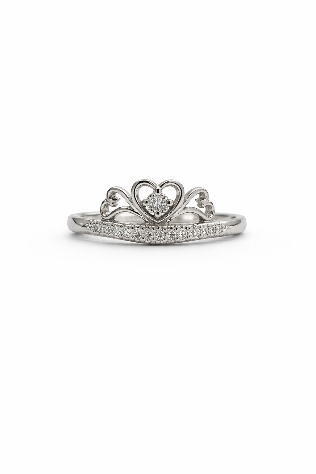 A graceful pure silver ring featuring a heart-shaped crown design with sparkling stones, symbolizing love, royalty, and timeless beauty.