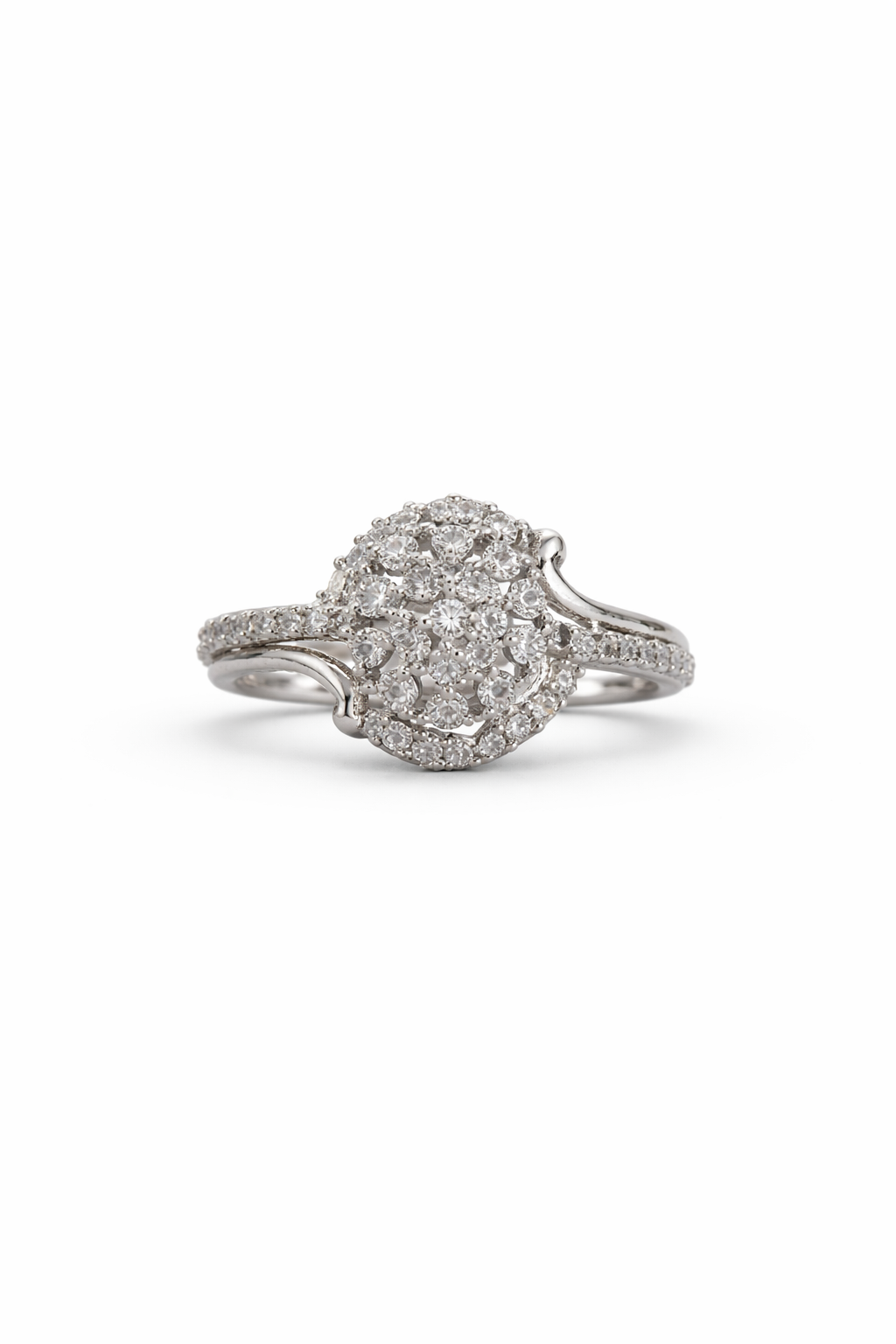 A dazzling pure silver ring featuring a floral-inspired halo of sparkling stones, designed to capture timeless elegance and radiant beauty.