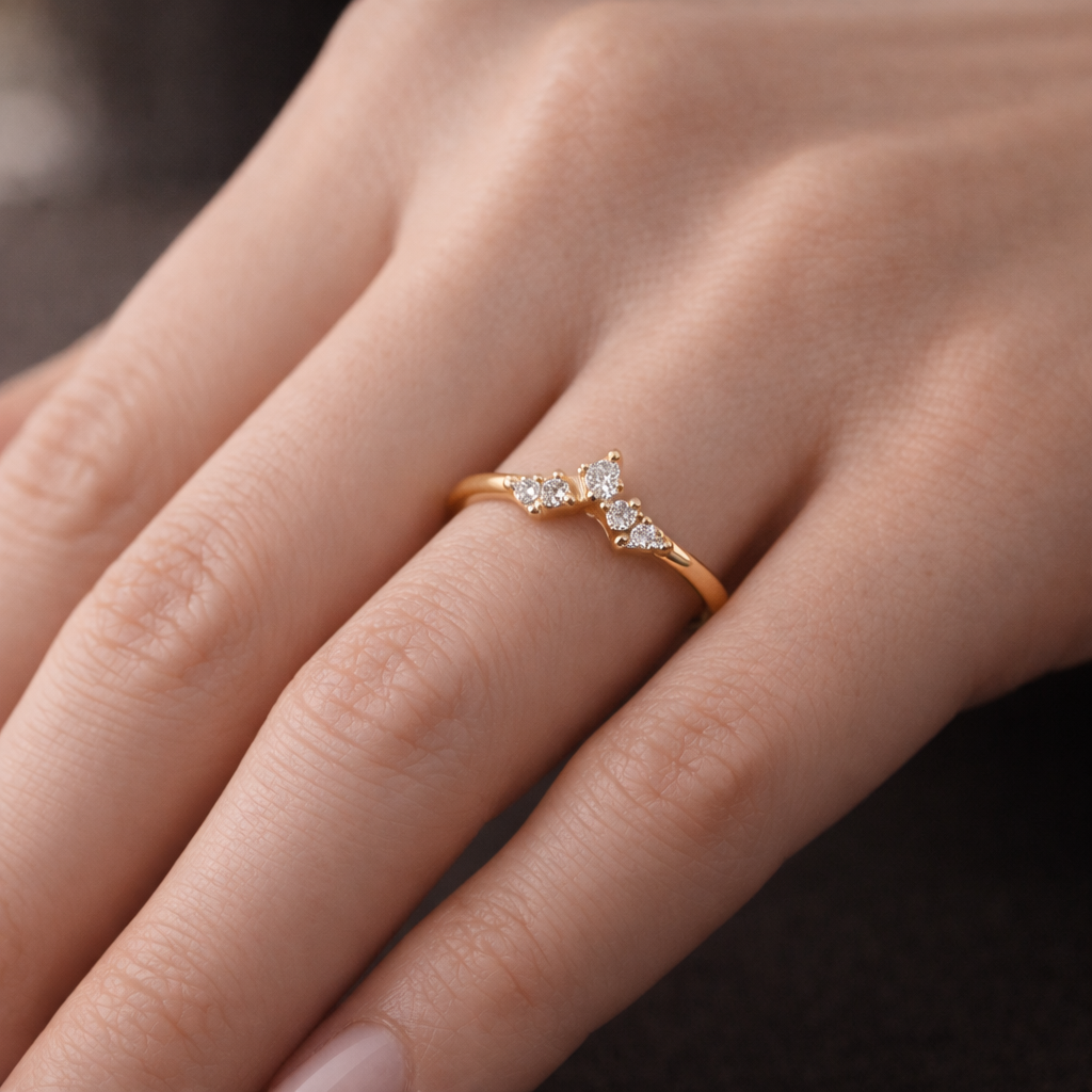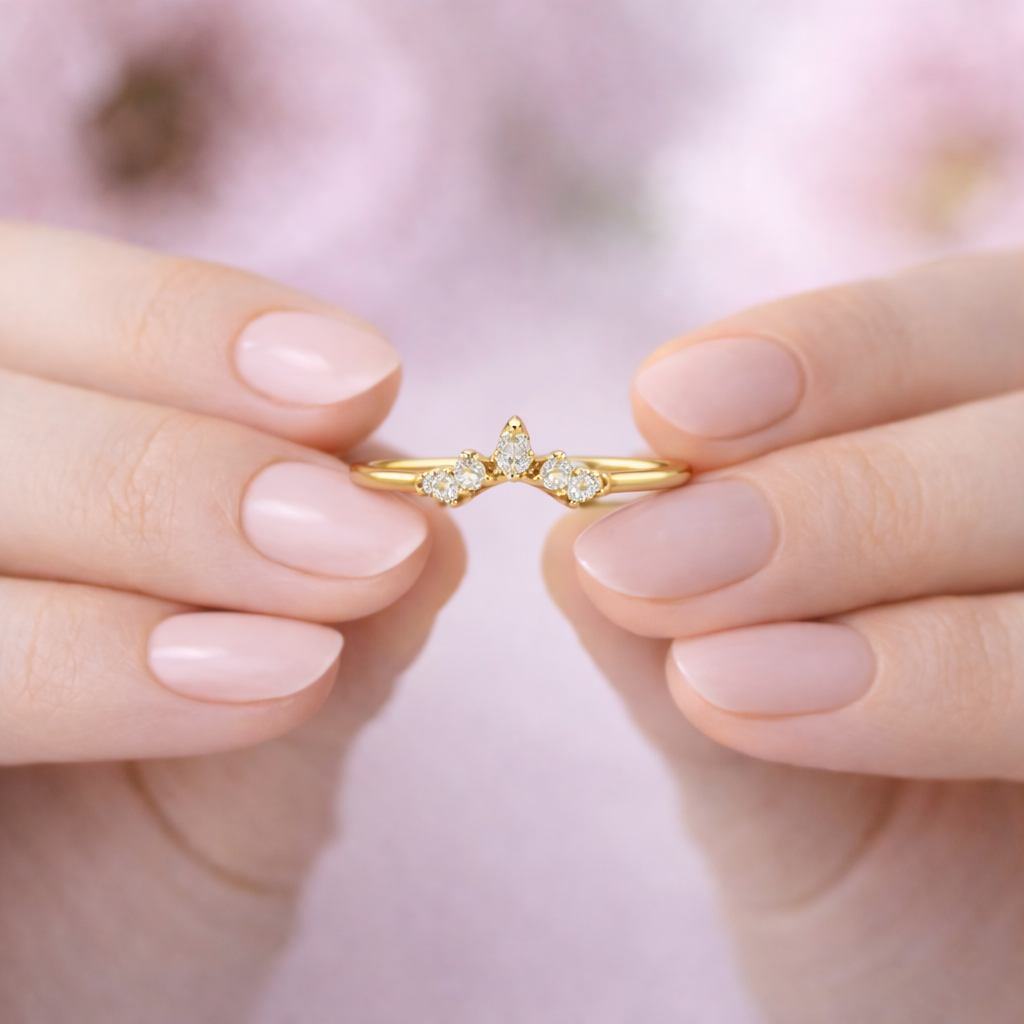 The gently curved design creates a graceful contour that fits beautifully against the finger, making it ideal for stacking or wearing alone. Each carefully set stone reflects light with subtle brilliance, while the smooth polished band ensures lasting comfort and durability.