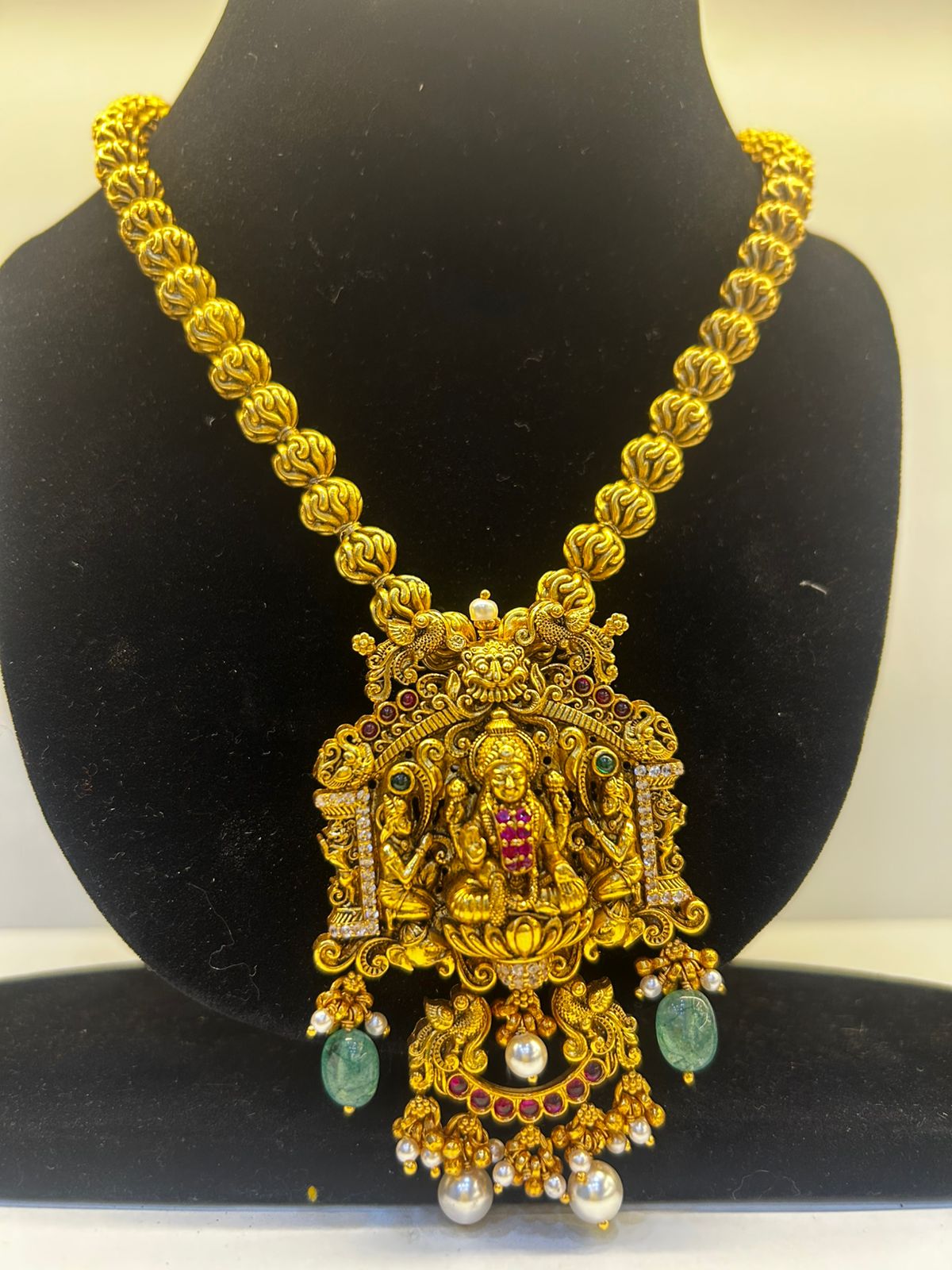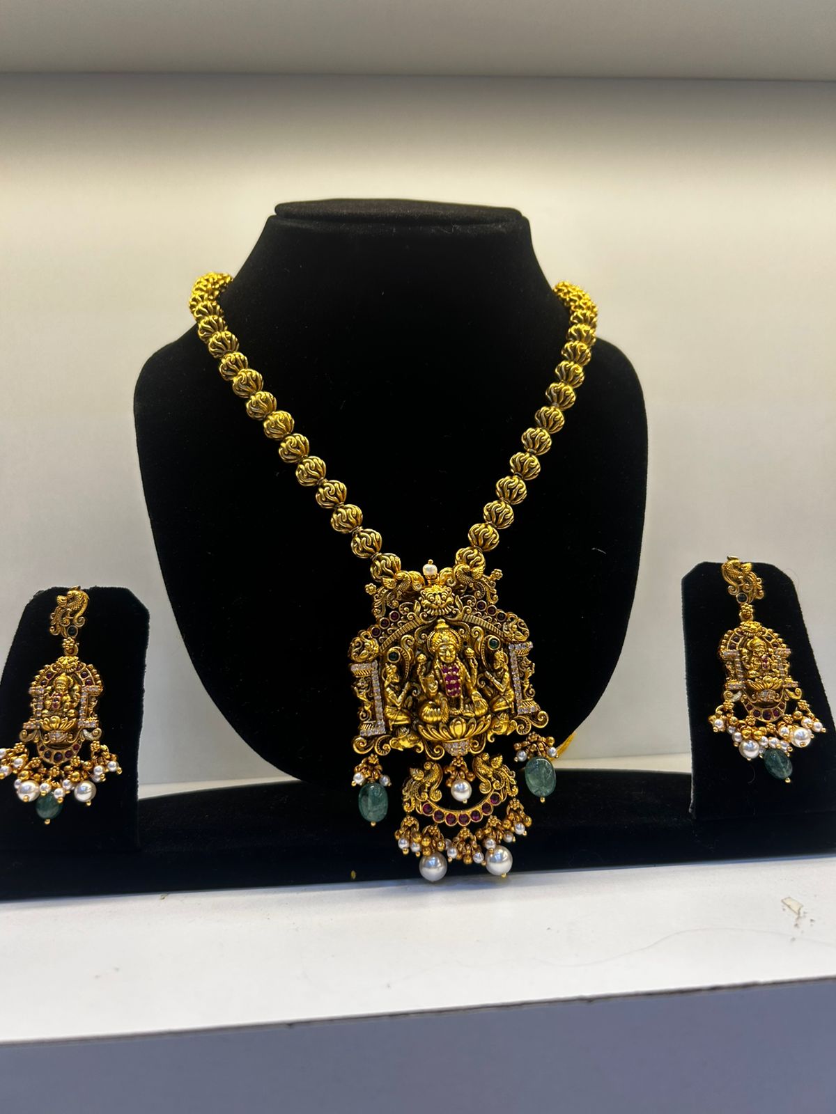 At the heart of the necklace lies a grand Mahalakshmi temple pendant, richly detailed with traditional motifs and deity carvings that symbolize prosperity, abundance, and grace. Accented with pearl clusters, ruby-toned highlights, and graceful green bead drops, the pendant adds depth, movement, and ceremonial charm. The matching earrings complete the ensemble, making it a statement set.