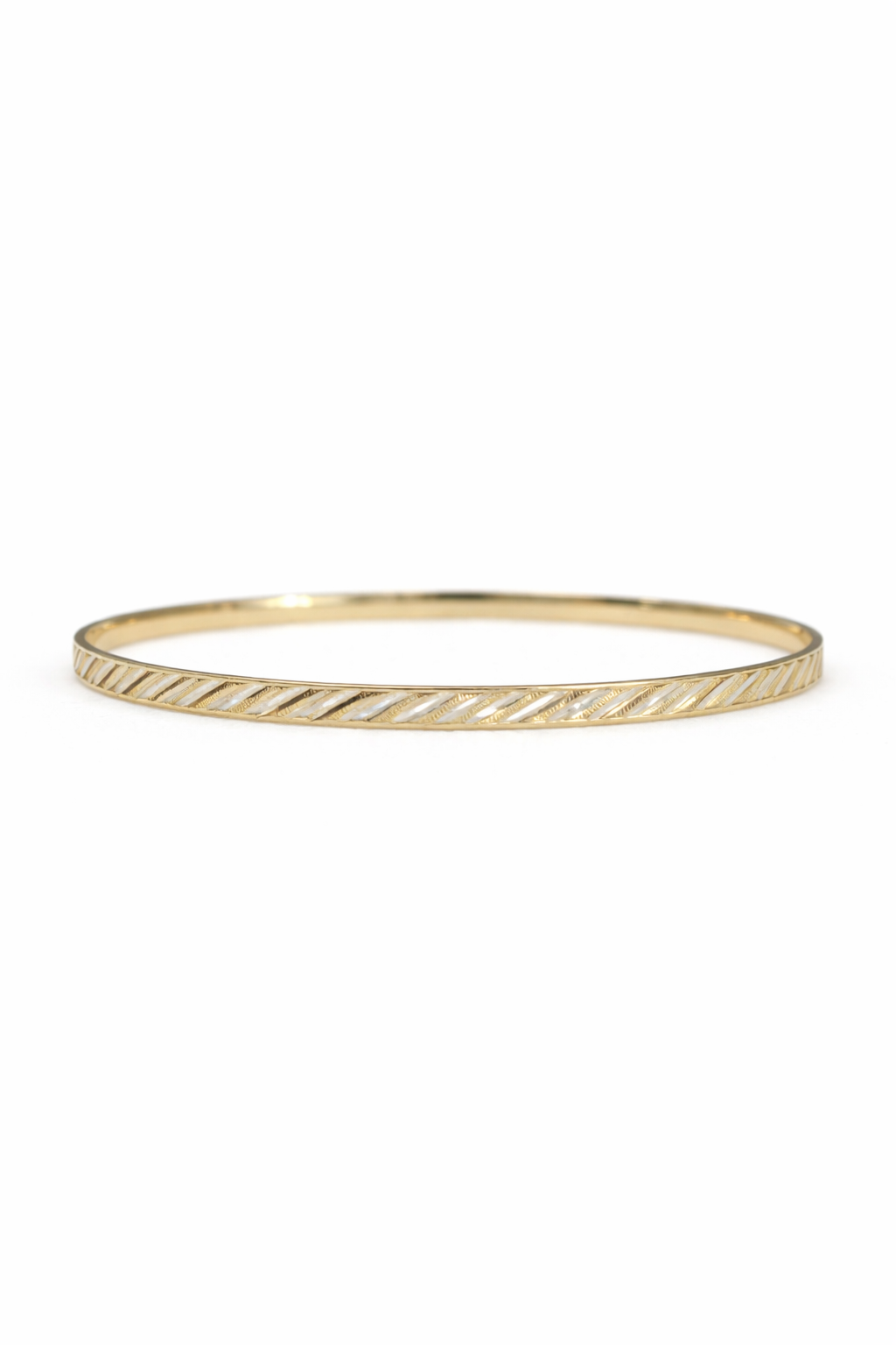 Its surface is beautifully detailed with precise diagonal cut patterns that catch the light from every angle, creating a subtle yet striking shimmer. The smooth inner finish ensures a comfortable fit, making it ideal for all-day wear.