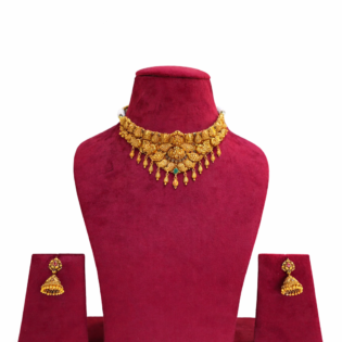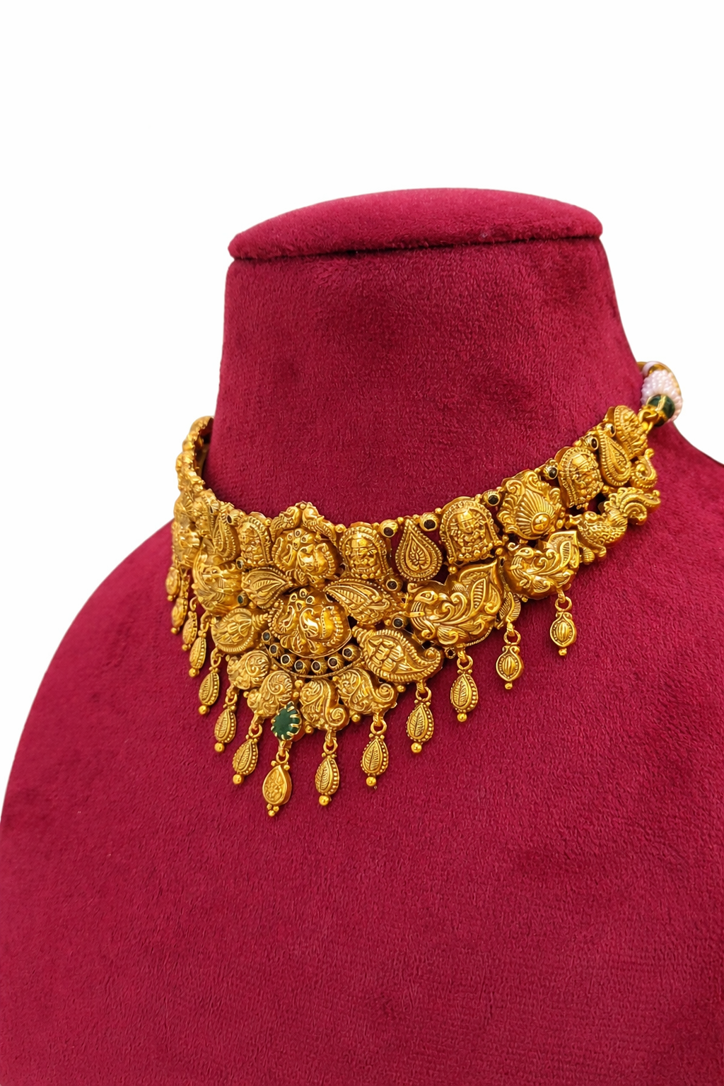 Inspired by classic temple jewellery designs, the necklace features intricate embossed motifs and finely detailed elements that reflect heritage artistry. The elegant gold-plated finish brings warmth and grandeur, while the delicate dangling accents add movement and charm to the overall design. Designed to sit gracefully along the neckline, it pairs beautifully with traditional attire such as silk sarees, lehengas, and festive ensembles.