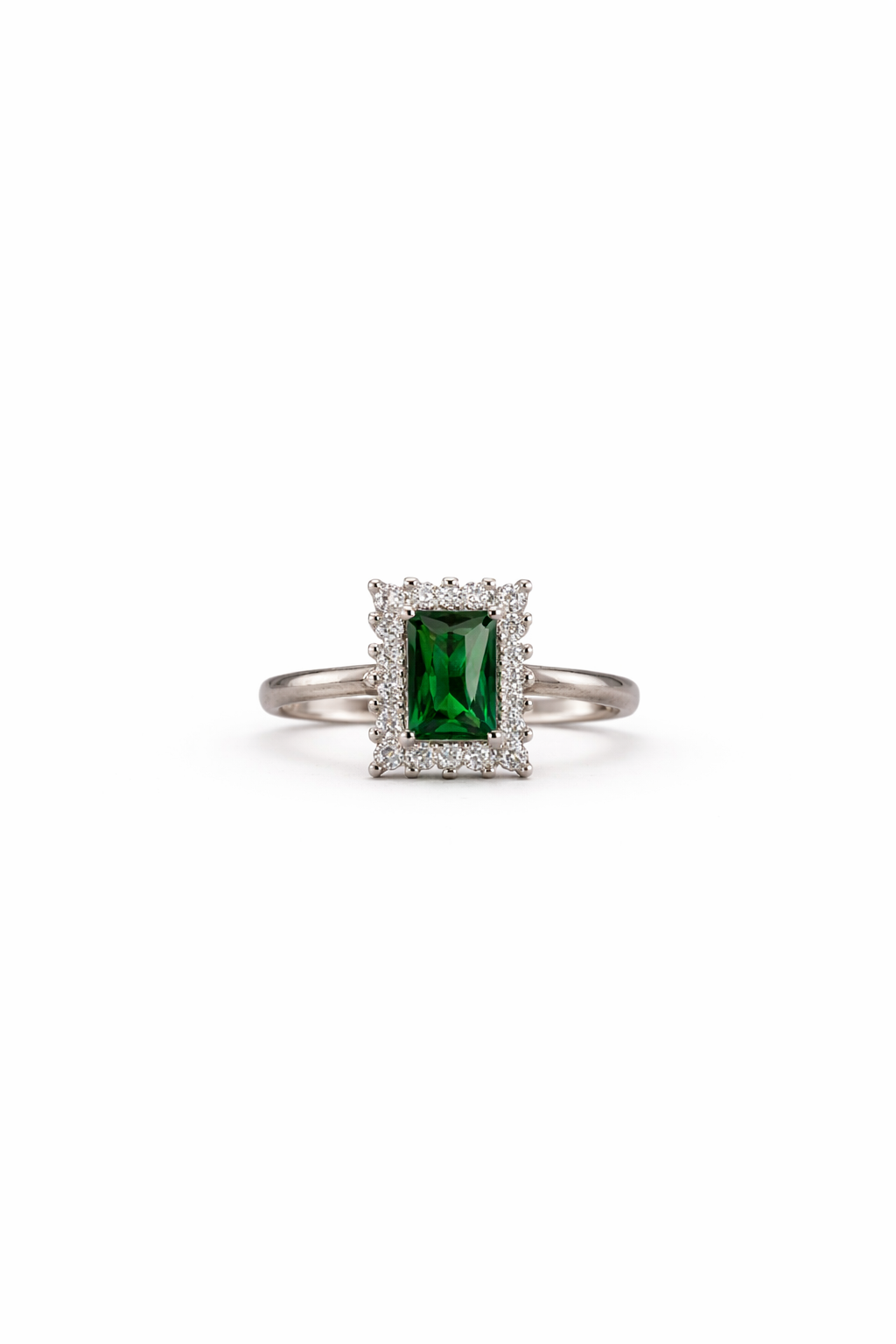 A sophisticated pure silver ring featuring a striking emerald-green rectangular centerpiece framed by a sparkling halo.Details